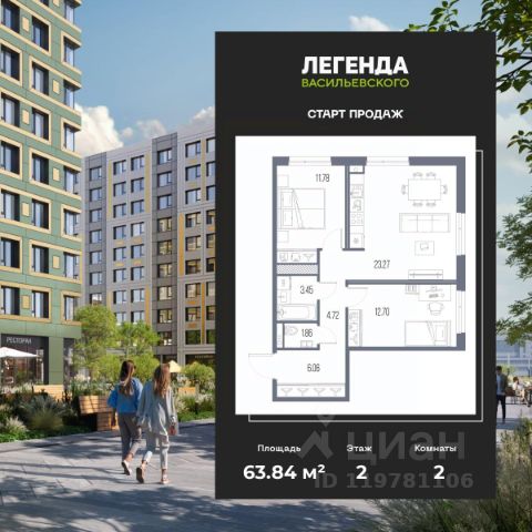 Квартира современного формата Евро-трехкомнатная, общая площадь составляет 67,5 м кв. Высота потолка 2,75 м.. Квартира с большой кухней-гостиной 22,1 м. кв., две отдельные комнаты: спальня 14,6 м. кв., кабинет 13,7 м. кв.; большая прихожая 12,0 м. кв. квадратной формы с двумя шкафами-купе. Санузел раздельный.