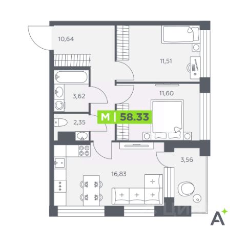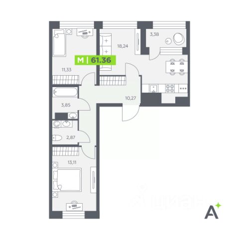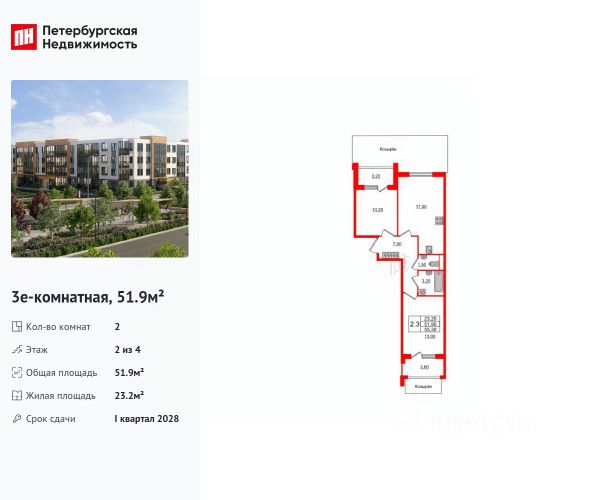 Квартира расположена 2-ом этаже (1-й этаж жилой). Окна выходят во двор. Общая площадь по ЕГРН 66.6 м.кв. + застекленный балкон 4.4 м.кв., комнаты 16.9 и 17.7 м.кв., кухня 12 м.кв., гардеробная 3 м.кв., коридор 10.3 м.кв., раздельный с/у: ванна 3.9 м.кв., туалет 2.8 м.кв.