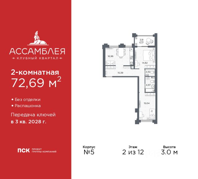 2-комн. квартира от застройщика в Клубный квартал "Ассамблея" на 2 этаже. Квартира без отделки, после оформления собственности можно делать ремонт. Общая площадь: 70.19 кв.м., жилая: 28.32 кв.м., площадь просторной кухни-столовой: 16.01 кв.м. Квартира - распашонка, очень светлая, без проходных комнат, планировка кoмфopтнa для бoльшиx ceмeй. В квартире одна лоджия, два совмещенных и один раздельный санузел. Высота потолков 3.0 м.