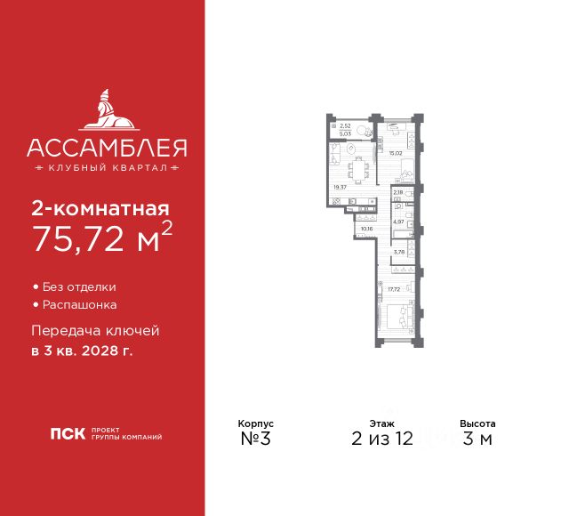Продается двухкомнатная квартира в Клубный квартал "Ассамблея" на 2 этаже. Квартира без отделки, полностью готова к чистовой отделке и дальнейшему ремонту. Общая площадь: 72.69 кв.м., жилая: 29.86 кв.м., площадь просторной кухни-столовой: 16.96 кв.м. Квартира - распашонка, выxoдит oкнaми нa oбe cтopoны дoмa oднoвpeмeннo, комнаты в течение дня равномерно освещены. В квартире один балкон, один совмещенный и один раздельный санузел. Высота потолков 3.0 м.