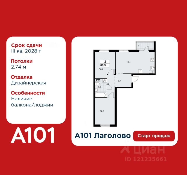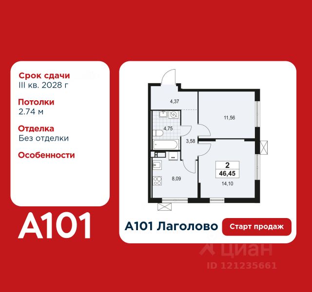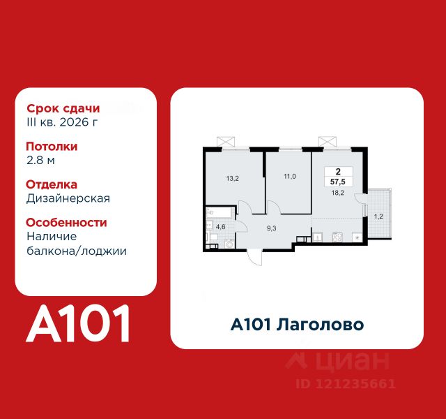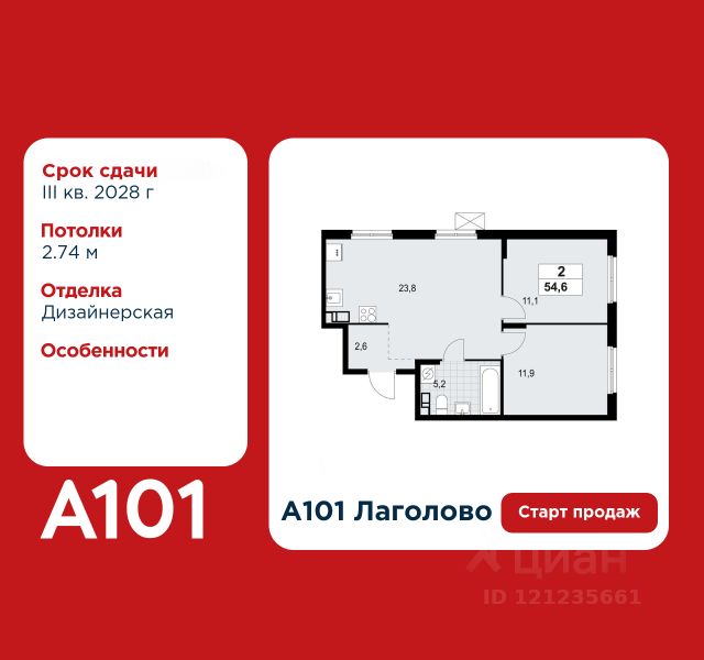 Старт продаж! 2-комнатная квартира площадью 54.56 в ЖК "А101 Лаголово" на 4 этаже. Квартира с отделкой. Вид из окна на улицу. В квартире 1 санузел. Высота потолков 2.74 м. Предложения от застройщика на ноябрь 2025: - Гибкая рассрочка 20 000 руб/мес. и первым взносом 10%. ОТДЕЛКА Для квартир с чистовой отделкой предлагается три варианта дизайна: Классика, Карелия светлая и Карелия темная. Варианты всех дизайнерских решений представлены на фотографиях. Подробности можно уточнить у менеджера. На все отделочные работы от застройщика предоставляется гарантия. ПАРАДНАЯ. В каждой парадной предусмотрены места для хранения велосипедов и колясок, гостевой санузел и удобная зона ожидания для гостей. ДВОРЫ И ОКРУЖЕНИЕ. Просторные дворы безопасны для детей, так как свободны от машин, закрыты от посторонних и постоянно находятся под видеонаблюдением. Во дворах создается разнообразная среда для детей всех возрастов: детские площадки с батутами, тактильными дорожками и игровыми комплексами. Для активного отдыха - воркаут-площадки, столы для пинг-понга и газоны для занятий йогой. Во дворах есть и тихие уголки - зеленые гостиные с уличной мебелью, где можно поработать на свежем воздухе или отдохнуть в тишине. Из внутренних дворов комплекса можно выйти на пешеходный бульвар длиной около 900 метров. Здесь будет организовано полноценное общественное пространство с амфитеатром, уличным кафе, ручьем, фонтаном и множеством мест для отдыха и игр. Большую часть бульвара займут благоустроенные зеленые зоны и теневые сады из десятков видов деревьев и кустарников, многолетних цветов и трав, которые будут радовать глаз круглый год. "А101 Лаголово" - современный город у подножия знаменитых Дудерговских высот, в объятиях чистейших озер и зеленых живописных массивов, наполненный всем необходимым для счастливой жизни. ИНФРАСТРУКТУРА. Мы занимаемся комплексным освоением территории. Наш приоритет - доступность всех сервисов для счастливой жизни. 1. Лаголово-город 15-ти минутной доступности. Вся необходимая инфраструктура: магазины, салоны красоты, образовательные учреждения, медицинские центры находятся в 15-ти минутах пешей прогулки от любой точки жилого комплекса. Это позволяет не тратить время на долгие перемещения. 2. Представьте идеальный город, где ребенок может спокойно играть, а пожилой человек наслаждаться заслуженным отдыхом. Жилая среда нашего комплекса может комфортно использоваться как 8-летним ребенком, так и 80-летним пожилым человеком. Дома, улицы, общественные пространства, тротуары спроектированы с заботой о людях разных возрастов. 3. Мы активно развиваем авторскую образовательную экосистему "Лёрнити". Она включает строительство 8 современных детских садов (2000 мест) и 3 школ (2945 учащихся). Мы учим родителей гармонично общаться с детьми, помогаем малышам подготовиться к школе, а подросткам - выбрать будущую профессию и развить таланты. Не хватает средств на покупку кладового помещения? Оформите ипотеку на квартиру и добавьте к ней часть стоимости к