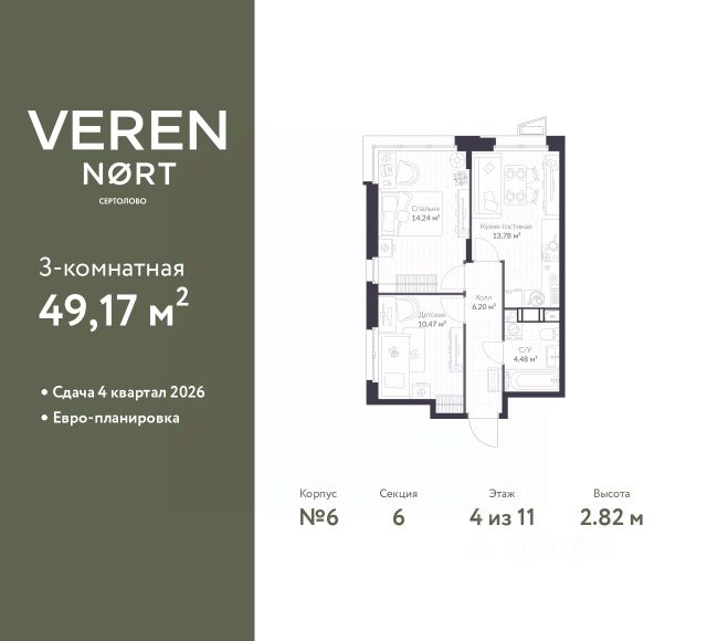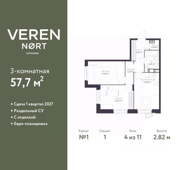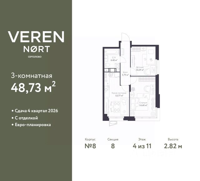Квартира расположена на 4-ом этаже 5-тиэтажного дома, в малоэтажном ЖК "Новое Сертолово", застройщик КВС.