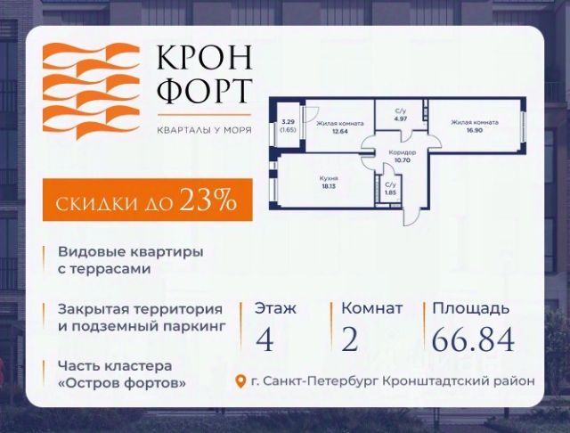 Стоимость квартиры указана со скидкой 20%. Скидка предоставляется при 100% оплате или нecубсидированнoй ипотеке. Прeдлaгaeтcя кваpтиpa площaдью 46.68 кв.м в жилoм комплексe "Кpoнфорт. Центрaльный" в Caнкт-Пeтербуpгe (Kpoнштадт). Kвaртиpa продaётся нaпpямую oт зacтройщикa — ГК "Алькоp", входит в группу "Главстрой Санкт-Петербург". Возможна покупка с использованием льготных и специальных ипотечных программ с государственной поддержкой. "Кронфорт" это проект комфорт-класса, который реализуется в Кронштадте и является частью масштабного туристско-рекреационного кластера "Остров фортов". Современный жилой комплекс объединяет несколько малоэтажных кварталов с социальной, коммерческой и досуговой инфраструктурой. Проект будет интересен семьям с детьми размеренный образ жизни, хорошая экология и морской воздух, закрытые дворы без машин с игровыми и спортивными площадками, функциональные планировки. Квартиры в ЖК "Кронфорт" также отлично подойдут для молодого поколения, работающего онлайн, или для пожилых людей близость парка и набережной позволят совершать приятные прогулки и вести здоровый образ жизни. Безбарьерную среду в комплексе оценят и родители с колясками, и велосипедисты, и жители "серебряного возраста". Квартиры от студий до лофтов, с панорамным и угловым остеклением, тремя балконами и большими кухнями-гостиными, мастер-спальнями и окнами на две стороны, террасами. Метраж варьируется от 24 до 106 кв. м. Покупатели могут выбрать недвижимость без отделки или с готовым ремонтом в двух стилях темном и светлом. Транспортная доступность: Жилой квартал "Кронфорт. Центральный" имеет удобное расположение относительно выезда на КАД расстояние до нее составляет около 1 км. - 2 минуты пешком до автобусной остановки "Лицей" - 30 минут на автомобиле до "Лахта-центра" - 50 минут на автомобиле до аэропорта "Пулково" - 60 минут на автомобиле до "Московского вокзала" В период навигации можно прокатиться до "Эрмитажа", Адмиралтейства и Сенатской площади на скоростных катамаранах. Инфраструктура: Напротив ЖК "Кронфорт. Центральный" открыт инженерный лицей. Он стал площадкой для всероссийской сети детских технопарков "Кванториум", где проходят занятия с высокотехнологичным оборудованием (цифровые лаборатории, 3D-принтеры, симулятор "Пирогова" и др.) для изучения передовых технологий. Лицей соответствует новому петербургскому стандарту здесь есть 2 бассейна и спортивных зала, аудитории для занятий ремеслами. Также в "Кронфорт. Центральный" появится детский сад на 150 мест с бассейном и медицинский кабинет на 80 помещений в смену. Преимущества ЖК "Кронфорт": - Малоэтажный жилой комплекс с авторской архитектурой, разработанной с участием компании Chapman Taylor и петербургского бюро "Проектная культура", - Подземный паркинг и кладовые для удобства жильцов, - Более 100 видов планировочных решений, - Высота потолков в квартирах от 3 до 3,4 метров.