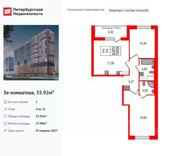 Продается уютная 2-комнатная квартира от застройщика в жилом комплексе "Город звезд" в новом городе на правом берегу Невы. До метро можно добраться на транспорте всего за 13 минут. Удобная, классическая, функциональная европланировка, большая кухня-гостиная 15.07 м², вместительная прихожая 6.29 м². Общая площадь квартиры - 49.13 м², жилая 23.06 м², высота потолка 2.77 м. Квартира продается с отделкой "Норд Лайн серый". Что особенного в ЖК "Город звезд"? • Инновационный Лицей Setl с оригинальной архитектурной концепцией и уникальной образовательной средой • Невский лесопарк под окнами - всегда свежий воздух и полноценный отдых на природе • Четыре тематические площади отдыха с разнообразным благоустройством • Аллея Звёзд - променад протяженностью 5 км с ландшафтным озеленением, зонами отдыха и велодорожкой • Выход на набережную реки Утки, где можно порыбачить или взять напрокат лодку • Единая входная группа с ресепшен и подземный паркинг