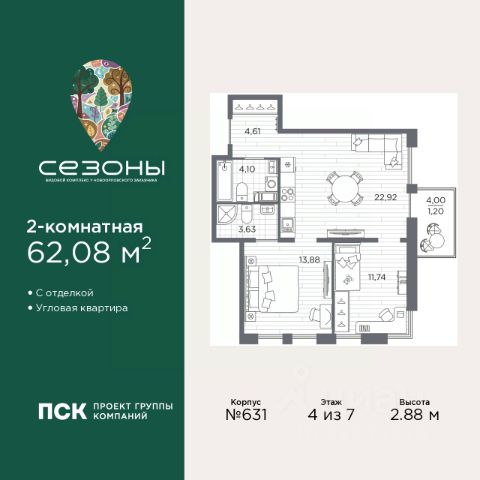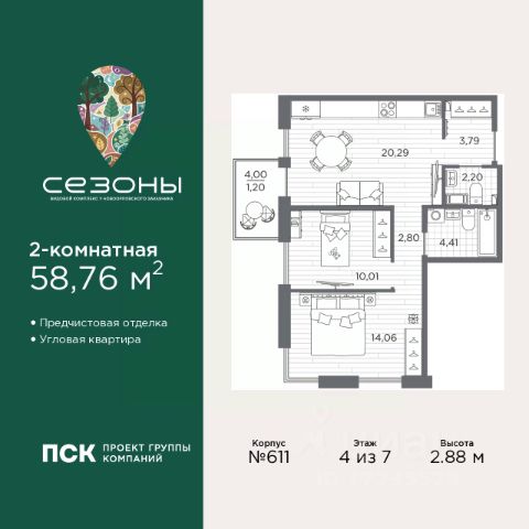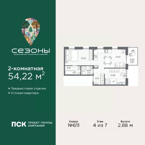 Двухкомнатная квартира с предчистовой отделкой в ЖК "Сезоны" на 4 этаже. Общая площадь: 54.22 кв.м., жилая: 23.51 кв.м., площадь просторной кухни-столовой: 17.07 кв.м. Угловая квартира, окна oбecпeчивaют paвнoмepнoe ocвeщeниe в тeчeниe дня. В квартире один балкон, два совмещенных санузла. Высота потолков 2.88 м. Дом монолитный, многоподъездный, высотой 7 этажей. Квартира находится в 1-й секции в корпусе 611. На этаже 4 квартиры. В подъезде 1 грузовой лифт. Начало строительства - 4 квартал 2025 года. Окончание строительства - 2 квартал 2028 года. Оформление сделки по договору долевого участия. Видовой жилой комплекс "Сезоны" от ГК ПСК возводится в одном из самых востребованных и престижных районов Санкт-Петербурга - Приморском, рядом с Суздальским и Выборгским шоссе. Такое расположение обеспечивает удобный выезд в разные части города, сочетая городской комфорт с близостью к природе. Всего в 50 метрах находится природный заказник "Новоорловский" и речка Каменка, а в пешей доступности - Суздальские озёра. Приморский район отличается развитой социальной и транспортной инфраструктурой. Здесь расположены крупные торговые и деловые центры, современные спортивные объекты, медицинские учреждения, магазины, кафе и рестораны. Комплекс включает четыре корпуса, ввод которых в эксплуатацию запланирован на 2028 год. Проект и прилегающий микрорайон разработаны в соответствии с концепцией "15-минутного города", при которой вся необходимая инфраструктура находится в шаговой доступности. В ближайшем окружении - две школы, пять детских садов, магазины, кафе, салоны красоты, банковские отделения и пункты выдачи заказов. Также предусмотрены два четырёхъярусных паркинга с лифтами на 288 машиномест. О застройщике ГК ПСК - один из крупнейших девелоперов Санкт-Петербурга с более чем 18-летней историей. Компания реализует проекты во всех сегментах недвижимости - от премиальных жилых комплексов до масштабных кварталов комфорт-класса и апарт-отелей. По данным портала ЕРЗ.РФ, ПСК входит в ТОП-3 крупнейших застройщиков Санкт-Петербурга по объёму текущего строительства. Портфель компании превышает 3 млн кв. м жилой и коммерческой недвижимости. Все объекты сдаются строго в срок и отличаются высоким уровнем архитектурных и инженерных решений. #270o41