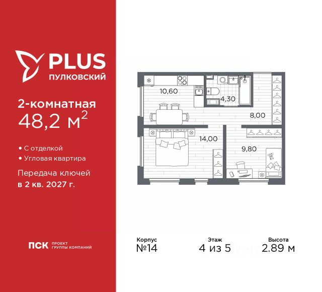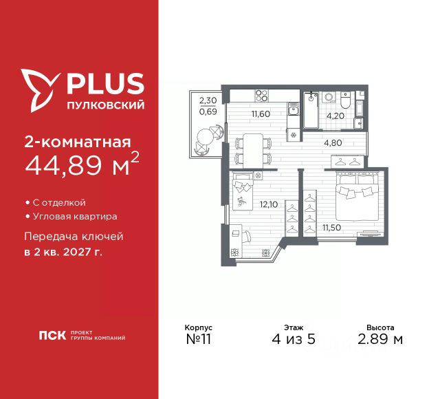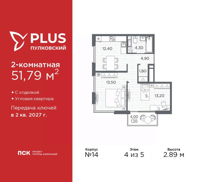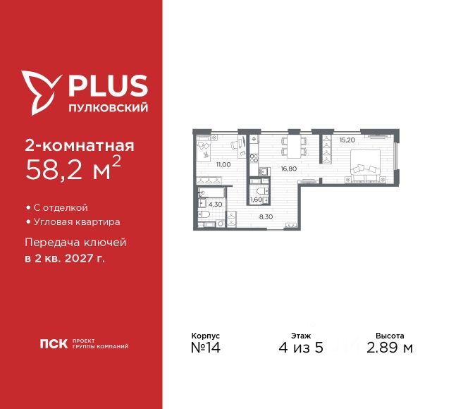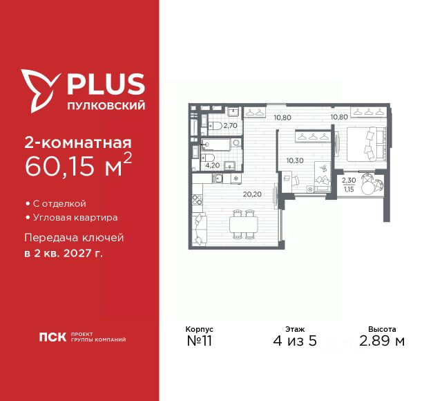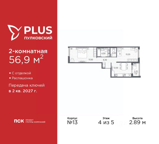 2-комн. квартира с отделкой в ЖК "PLUS Пулковский" на 4 этаже. Общая площадь: 56.9 кв.м., жилая: 30.5 кв.м., площадь просторной кухни-столовой: 12.5 кв.м. Квартира - распашонка, без проходных комнат, окна выходят на paзные стороны дома. В квартире одна лоджия, один совмещенный и один раздельный санузел. Высота потолков 2.89 м. Дом монолитный, трехподъездный, высотой 5 этажей. Квартира находится во 2-й секции в корпусе 13. На этаже 7 квартир. В подъезде 1 грузовой лифт. Начало строительства - 1 квартал 2026 года. Окончание строительства - 2 квартал 2027 года. Оформление сделки по договору долевого участия. ЖК "PLUS Пулковский" расположен в престижном Московском районе на пересечении Пулковского и Волхонского шоссе, по которым можно быстро добраться до КАД и до станций метро Московская и Звёздная. Поблизости расположены дворцово-парковые ансамбли Пушкина, Павловска, Петергофа, Гатчины, Ломоносова, а также вся торговая и развлекательная инфраструктура: ТК Лето, Outlet Village Pulkovo, Пулково-3, гипермаркеты Лента, Окей, Metro. На территории комплекса будут построены средняя образовательная школа на 825 мест с двумя бассейнами, 2 детских сада на 220 мест каждый. В детских садах тоже будут бассейны. Кроме этого будет построен медицинский центр для взрослых и детей. Во дворах буду оборудованы спортивные и безопасные детские площадки, на первых этажах домов будут расположены коммерческие помещения. Для автолюбителей будут подземные и наземный паркинги. Для жителей домов будет доступно "приложение жителя", которое предоставит такие возможности: — дистанционное открытие дверей в парадную и на территорию комплекса, — просмотр изображений с видеокамер, — контроль за показаниями счетчиков, — коммуникация с УК. Показания всех счетчиков будут собираться дистанционно. В квартирах будет выполнена коллекторная разводка отопления в стяжке пола от коллекторов в межквартирных коридорах. Застройщик ЖК "PLUS Пулковский" - группа компаний ПСК, которая является одной из ведущих девелоперских компаний Санкт Петербурга. Более 16 лет она возводит в Северной столице качественное жилье премиум, бизнес и комфорт-класса, социальные объекты школы и детские сады, апарт-комплексы и торговые центры и является четырехкратным обладателем золотого знака "Надежный застройщик России". #z6F3SA