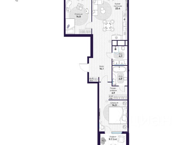 Покупателям предлагается разнообразный выбор планировок элитного жилья, начиная от просторных однокомнатных квартир и заканчивая пятикомнатными видовыми пентхаусами. Высота потолков в помещениях составляет 3-3.8 метра. Во всех форматах жилья предусмотрены большие кухни (от 12 кв. м), зонированные прихожие с отдельными гардеробными, увеличенные оконные проемы, ниши для установки кондиционеров и изолированные от бытовых помещений спальни. Разнообразие планировок включает варианты с просторными террасами, объединенными кухнями-гостиными, раздельными санузлами и дополнительными туалетами, эркерами и помещениями нестандартной формы. Площадь квартир - 46.87-300.79 квадратных метров.