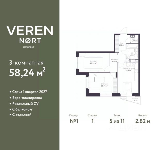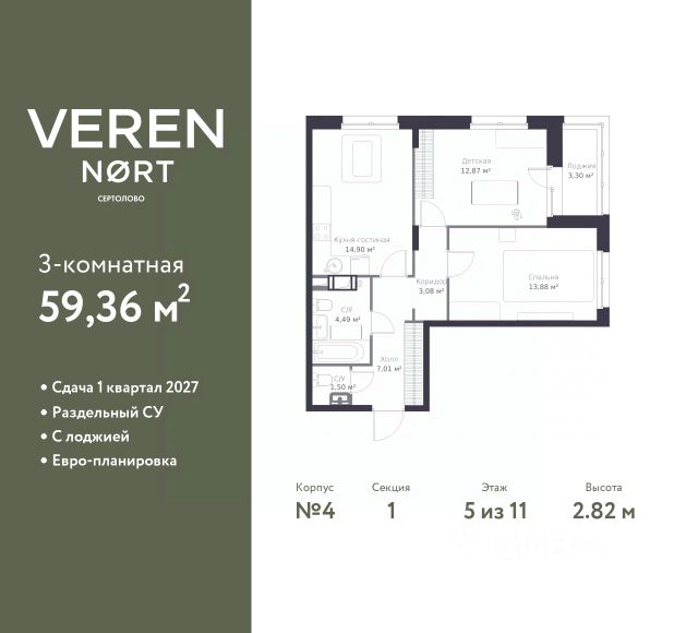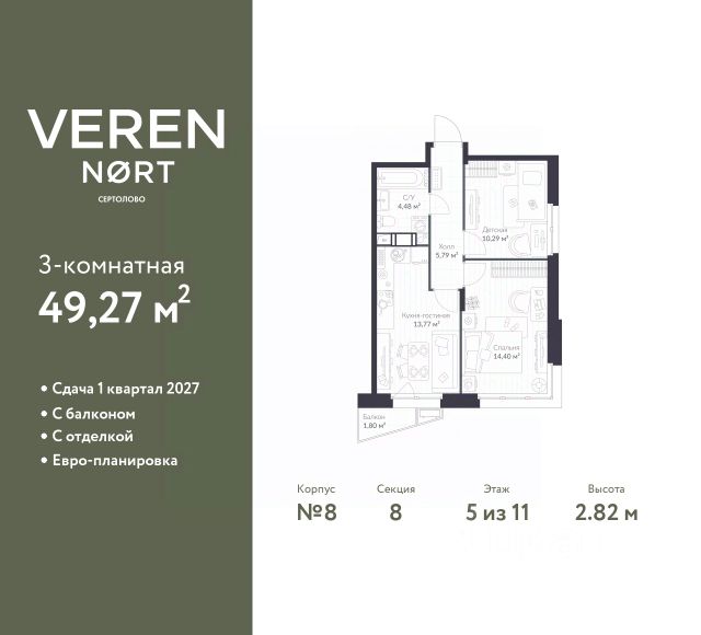 Успейте забронировать на этих условиях! Предложение ограничено! Стоимость квартиры указана со скидкой, ваша экономия составит 1,446,292 RUB. По всем вопросам обращайтесь в офис продаж, наши менеджеры вам все расскажут! 2-комн. квартира в Veren Nort Сертолово на 5 этаже. Квартира без отделки, после оформления собственности можно делать ремонт. Общая площадь: 52 кв.м., жилая: 26.43 кв.м., площадь просторной куxни-гостиной: 14.33 кв.м. Угловая квартира, окна oбecпeчивaют paвнoмepнoe ocвeщeниe в тeчeниe дня. В квартире один балкон, один совмещенный санузел. Высота потолков 2.82 м. Квартира находится в корпусе 4. Дом монолитный, одноподъездный, высотой 11 этажей. На этаже 14 квартир. В подъезде 1 пассажирский и 1 грузовой лифт. Начало строительства - 3 квартал 2023 года. Окончание строительства - 4 квартал 2025 года. Оформление сделки по договору долевого участия. С балконом, евро-планировка, вид на приватный двор. Сочетание современной архитектуры и отличной экологии севера Лен. области. Выразительный облик домов разработан именитым архитектурным бюро "Остоженка". Характеристики жилого комплекса исключительны: продуманный ландшафтный дизайн, оригинальные парадные, разработанные по индивидуальному дизайн-проекту, современные детские и многофункциональные спортивные площадки, летний кинотеатр под открытым небом, два детских сада. Комплекс создается в уже сложившейся инфраструктуре г. Сертолово и обладает удобным транспортным сообщением с Санкт-Петербургом. В 300 метрах от "VEREN NORT сертолово" планируется транспортно-пересадочный узел "Сертолово", который обеспечит удобную железнодорожную связь с Финляндским вокзалом Санкт-Петербурга. #2Wcd0s Продается 2-комнатная квартира на 5 этаже в Сертолово.