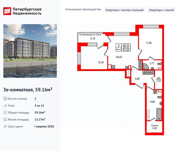 Цена действует при 100% оплате и на определенные ипотечные программы. Подробности — в отделе продаж по телефону. Продаётся 2-комнатная квартира в ЖК "Цивилизация на Неве" на 5 этаже. Общая площадь составляет 63.17 кв. м. Квартира с white box отделкой. Жилой комплекс "Цивилизация на Неве" располагается по адресу Санкт-Петербург, Невский. "Цивилизация на Неве" - видовые дома бизнес-класса, расположенные вдоль набережной Невы, всего в 7 км от исторического центра. Жилой комплекс идеально выражает особый дух, свойственный знаменитым просторным кварталам постройки сталинской эпохи в Москве и на Московском проспекте в Петербурге. Расположение: • 15 мин на авто до Невского проспекта; • 15 мин на авто до Московского вокзала; • 5 мин на авто до станции метро "Улица Дыбенко"; • 14 мин (7 км) до КАД. Уникальный дизайн входных зон, закрытая территория, видеонаблюдение и охрана, подземный паркинг с лифтом и другие особенности проекта отвечают заявленному классу. В каждом дворе предусмотрено озеленение по индивидуальному ландшафтному проекту с благородными растениями и кустарниками. Преимущества: • Закрытая территория с видеонаблюдением; • Подземный паркинг с лифтом; • Детская площадка на приватной безопасной территории; • Несколько детских садов и школ; • Инфраструктура шаговой доступности на первых этажах корпусов. Успейте приобрести квартиру на выгодных условиях! Чтобы узнать подробности, обращайтесь за консультацией по телефону.