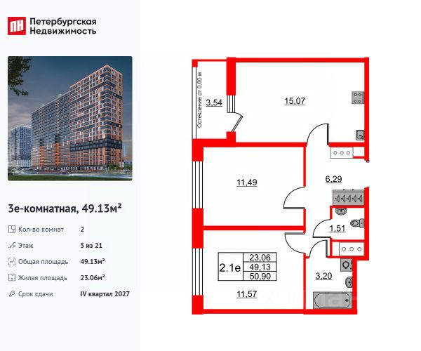 Продается уютная 2-комнатная квартира от застройщика в жилом комплексе "Город звезд" в новом городе на правом берегу Невы. До метро можно добраться на транспорте всего за 13 минут. Удобная, классическая, функциональная европланировка, большая кухня-гостиная 15.07 м², вместительная прихожая 6.29 м². Общая площадь квартиры - 49.13 м², жилая 23.06 м², высота потолка 2.77 м. Квартира продается с отделкой "Норд Лайн светлый". Что особенного в ЖК "Город звезд"? • Инновационный Лицей Setl с оригинальной архитектурной концепцией и уникальной образовательной средой • Невский лесопарк под окнами - всегда свежий воздух и полноценный отдых на природе • Четыре тематические площади отдыха с разнообразным благоустройством • Аллея Звёзд - променад протяженностью 5 км с ландшафтным озеленением, зонами отдыха и велодорожкой • Выход на набережную реки Утки, где можно порыбачить или взять напрокат лодку • Единая входная группа с ресепшен и подземный паркинг
