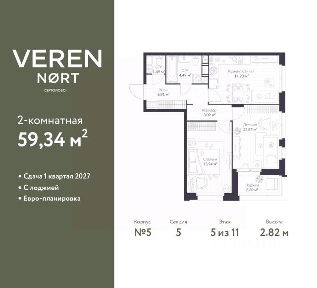 2 - комнатная квартира на 5 этаже общей площадью 60,44 м² в IV очереди в жилом комплексе Сертолово Парк от застройщика ГК Алгоритм. Все квартиры в ЖК Сертолово Парк сдаются с чистовой отделкой в скандинавском стиле. Въезжайте и живите без дополнительных затрат на ремонт. Увеличенные оконные проемы и потолки высотой 2,74 м придают квартирам в ЖК Сертолово Парк ощущение простора, обеспечивая максимальное естественное освещение и свежий воздух. Энергосберегающий дом строится по финским технологиям: наружные стены изготовлены из заводских трехслойных железобетонных панелей толщиной 390 мм, фасады утеплены - толщина утеплителя 150 мм - и закрыты декоративным слоем -толщина 90 мм. Расположение ЖК: идеальное место для комфортной жизни в городе Сертолово. В 200 метрах находится детская и взрослая поликлиники. Вблизи детские сады и школы. ЖК Сертолово Парк окружен прекрасным лесным массивом, что создает уникальную атмосферу спокойствия и природной красоты прямо за порогом вашего дома. Для детей и взрослых на территории ЖК имеются детские и спортивные площадки. Кроме того, чтобы обеспечить безопасность и уединенность, территория жилого комплекса полностью закрыта. 4 закрытых многоуровневых наземных паркингов с грузовым лифтом на 1200 машин.