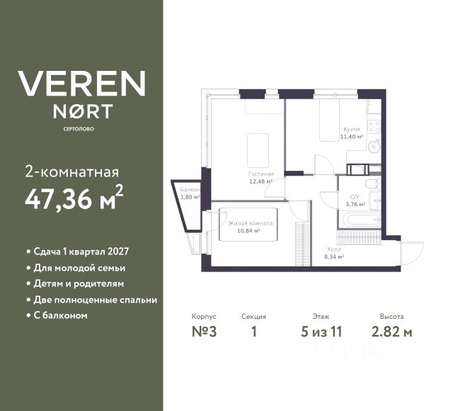 Успейте оформить бронирование по этой цене! Предложение ограничено! Стоимость квартиры указана со скидкой, ваша экономия составит 820,683 RUB. По всем вопросам звоните в офис продаж, наши менеджеры вам все расскажут! 2-комн. квартира в Veren Nort Сертолово на 5 этаже. Квартира без отделки, новый собственник может сделать ремонт по своему дизайн-проекту. Общая площадь: 45.03 кв.м., жилая: 21.99 кв.м., площадь просторной куxни-гостиной: 11.43 кв.м. Квартира угловая, очень светлая, естественная вентиляция при открытии окон. В квартире один балкон, один совмещенный санузел. Высота потолков 2.82 м. Квартира находится в корпусе 7. Дом монолитный, одноподъездный, высотой 11 этажей. На этаже 14 квартир. В подъезде 1 пассажирский и 1 грузовой лифт. Окончание строительства - 4 квартал 2026 года. Оформление сделки по договору долевого участия. С балконом, вид на приватный двор. Сочетание современной архитектуры и отличной экологии севера Лен. области. Выразительный облик домов разработан именитым архитектурным бюро "Остоженка". Характеристики жилого комплекса исключительны: продуманный ландшафтный дизайн, оригинальные парадные, разработанные по индивидуальному дизайн-проекту, современные детские и многофункциональные спортивные площадки, летний кинотеатр под открытым небом, два детских сада. Комплекс создается в уже сложившейся инфраструктуре г. Сертолово и обладает удобным транспортным сообщением с Санкт-Петербургом. В 300 метрах от "VEREN NORT сертолово" планируется транспортно-пересадочный узел "Сертолово", который обеспечит удобную железнодорожную связь с Финляндским вокзалом Санкт-Петербурга. #zwE6tv