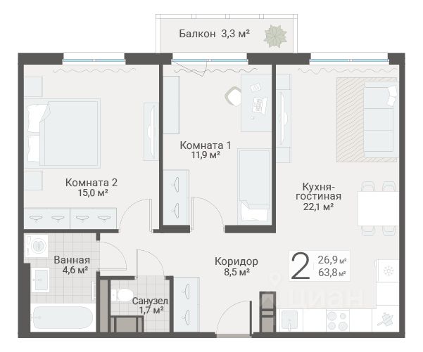 • Комнаты изолированные (гостиная - 15,25, спальня - 12,2 м2). Мебель остается по договоренности;
