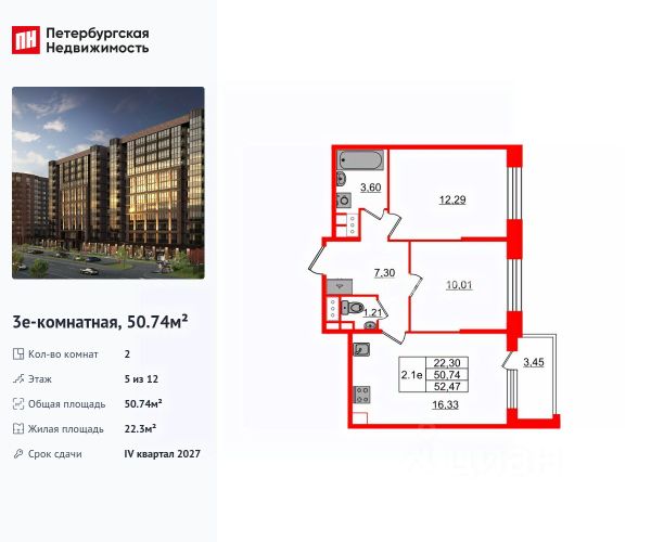 Квартира расположена на 5 этаже 19-ти этажного дома, просторная планировка предусматривает две спальные комнаты, 20 кв м и 17 кв.м., кухню-гостиную 46 кв м, санузел 2.56 кв.м., ванную комнату 3,9 кв.м., лоджию 7,6 кв.м.