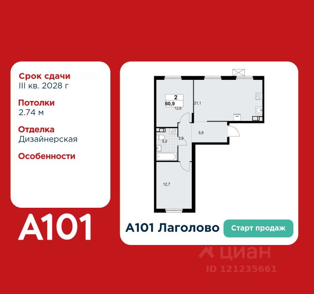 Старт продаж! 2-комнатная квартира площадью 54.56 в ЖК "А101 Лаголово" на 6 этаже. Квартира с отделкой. Вид из окна на улицу. В квартире 1 санузел. Высота потолков 2.74 м. Предложения от застройщика на декабрь 2025: - Гибкая рассрочка 20 000 руб/мес. и первым взносом 10%. ОТДЕЛКА Для квартир с чистовой отделкой предлагается три варианта дизайна: Классика, Карелия светлая и Карелия темная. Варианты всех дизайнерских решений представлены на фотографиях. Подробности можно уточнить у менеджера. На все отделочные работы от застройщика предоставляется гарантия. ПАРАДНАЯ. В каждой парадной предусмотрены места для хранения велосипедов и колясок, гостевой санузел и удобная зона ожидания для гостей. ДВОРЫ И ОКРУЖЕНИЕ. Просторные дворы безопасны для детей, так как свободны от машин, закрыты от посторонних и постоянно находятся под видеонаблюдением. Во дворах создается разнообразная среда для детей всех возрастов: детские площадки с батутами, тактильными дорожками и игровыми комплексами. Для активного отдыха - воркаут-площадки, столы для пинг-понга и газоны для занятий йогой. Во дворах есть и тихие уголки - зеленые гостиные с уличной мебелью, где можно поработать на свежем воздухе или отдохнуть в тишине. Из внутренних дворов комплекса можно выйти на пешеходный бульвар длиной около 900 метров. Здесь будет организовано полноценное общественное пространство с амфитеатром, уличным кафе, ручьем, фонтаном и множеством мест для отдыха и игр. Большую часть бульвара займут благоустроенные зеленые зоны и теневые сады из десятков видов деревьев и кустарников, многолетних цветов и трав, которые будут радовать глаз круглый год. "А101 Лаголово" - современный город у подножия знаменитых Дудерговских высот, в объятиях чистейших озер и зеленых живописных массивов, наполненный всем необходимым для счастливой жизни. ИНФРАСТРУКТУРА. Мы занимаемся комплексным освоением территории. Наш приоритет - доступность всех сервисов для счастливой жизни. 1. Лаголово-город 15-ти минутной доступности. Вся необходимая инфраструктура: магазины, салоны красоты, образовательные учреждения, медицинские центры находятся в 15-ти минутах пешей прогулки от любой точки жилого комплекса. Это позволяет не тратить время на долгие перемещения. 2. Представьте идеальный город, где ребенок может спокойно играть, а пожилой человек наслаждаться заслуженным отдыхом. Жилая среда нашего комплекса может комфортно использоваться как 8-летним ребенком, так и 80-летним пожилым человеком. Дома, улицы, общественные пространства, тротуары спроектированы с заботой о людях разных возрастов. 3. Мы активно развиваем авторскую образовательную экосистему "Лёрнити". Она включает строительство 8 современных детских садов (2000 мест) и 3 школ (2945 учащихся). Мы учим родителей гармонично общаться с детьми, помогаем малышам подготовиться к школе, а подросткам - выбрать будущую профессию и развить таланты. Не хватает средств на покупку кладового помещения? Оформите ипотеку на квартиру и добавьте к ней часть стоимости