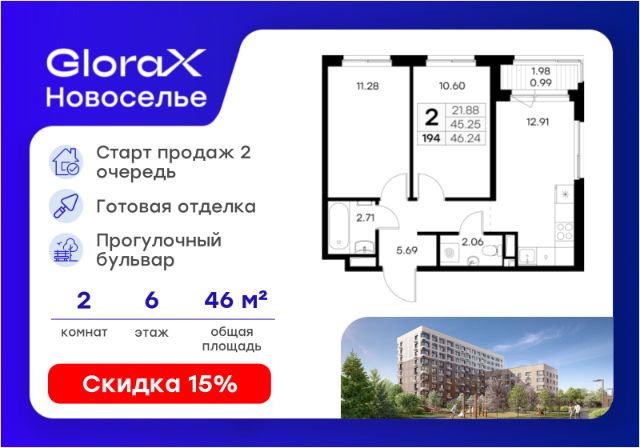 Продается 2-комн. квартира на 6-м этаже в строящемся проекте комфорт-класса GloraX Новоселье. Общая площадь лота составляет 46,11 кв. м, из которых 21,18 кв. м отведено под жилую и 13,53 кв. м под кухонную зону. Номер квартиры - 286 Преимущества квартиры: - Квартиры комфорт-класса с чистовой отделкой в двух цветовых гаммах на выбор - Зеленый район, 5 мин. до Гореловсого лесопарки, 10 мин. до Шунгеровского заказника - 7 мин. до КАД, 16 мин. до ЗСД - 864 м/м на открытой стоянке - Благоустроенный собственный прогулочный бульвар - Закрытые дворы с видеонаблюдением - Детские площадки с геопласткой и бизиборадми - Сад и школа в шаговой доступности - Спортивные площадки и вело-дорожки - Коммерческие помещения на 1 этажах GloraX Новоселье — новый проект комфорт-класса на юго-западной границе Санкт-Петербурга и Ленинградской области. Близость к зеленым зонам Гореловского лесопарка и природного Шунгеровского заказника, а также пешеходный многофункциональный бульвар в центре квартала — идеальное место для тех, кто ценит природу и тишину, при этом не готов отказываться от благ современной инфраструктуры. Застройка осуществляется в рамках единой концепции, предусматривающей не только создание комфортного жилья, но и формирование собственной внутренней благоустроенной среды. Территория каждого двора разделена на зоны отдыха, досуга и игровые площадки с учетом возраста и потребностей детей и взрослых создает неповторимую атмосферу, заряжающую энергией на новые свершения. Это проект, в котором спокойно во всех отношениях. Живите на природе, но с комфортом мегаполиса. Проведите теплые дни в Гореловском лесопарке. Познакомьте детей с историей в Стрельне, Петергофе или Красном селе. Они разположены в 30 минутах от проекта. До ж/д станции "Сергиево" 11 минут на автомобиле, до метро Проспект Ветеранов 20 минут, КАД 7 минут, ЗСД 16 минут. В шаговой доступности остановка общественного транспорта. Рядом с проектом будут построены школа и детский сад. Здесь все создано для максимального комфорта каждого жителя. Приватное пространство внутреннего двора с беседками для работы и отдыха, зеленый двор с уютным многоуровневым освещением, детскими эко-площадками и спортивными workout создает неповторимую атмосферу, заряжающую энергией на новые свершения. Цена указана при 100% оплате или стандартной ипотеке. Узнайте подробности в Отделе продаж.