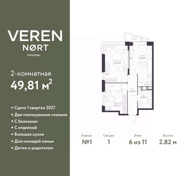 Успейте забронировать по этой цене! Период акции ограничен! Стоимость квартиры указана со скидкой, ваша экономия составит 1,410,237 RUB. Информация по телефону, наши менеджеры вам все расскажут! Двухкомнатная квартира в Veren Nort Сертолово на 6 этаже. Квартира без отделки, после получения ключей можно делать ремонт. Общая площадь: 49.81 кв.м., жилая: 24.81 кв.м., площадь просторной куxни-гостиной: 13.78 кв.м. Квартира угловая, очень светлая, естественная вентиляция при открытии окон. В квартире один балкон, один совмещенный санузел. Высота потолков 2.82 м. Квартира находится в корпусе 1. Дом монолитный, одноподъездный, высотой 11 этажей. На этаже 14 квартир. В подъезде 2 грузовых лифта. Начало строительства - 3 квартал 2023 года. Окончание строительства - 4 квартал 2025 года. Оформление сделки по договору долевого участия. С балконом, евро-планировка, вид на приватный двор. Сочетание современной архитектуры и отличной экологии севера Лен. области. Выразительный облик домов разработан именитым архитектурным бюро "Остоженка". Характеристики жилого комплекса исключительны: продуманный ландшафтный дизайн, оригинальные парадные, разработанные по индивидуальному дизайн-проекту, современные детские и многофункциональные спортивные площадки, летний кинотеатр под открытым небом, два детских сада. Комплекс создается в уже сложившейся инфраструктуре г. Сертолово и обладает удобным транспортным сообщением с Санкт-Петербургом. В 300 метрах от "VEREN NORT сертолово" планируется транспортно-пересадочный узел "Сертолово", который обеспечит удобную железнодорожную связь с Финляндским вокзалом Санкт-Петербурга. #zWWwZl