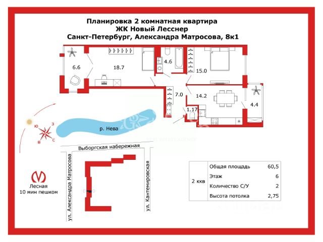 Квартира с двумя спальнями в комплексе "Сампсониевский 32" от LEGENDA на 6 этаже. -Общая площадь: 70.84 кв.м. -Жилая: 26.04 кв.м. -Площадь просторной кухни-столовой: 21.07 кв.м. -Высота потолков 2.7 м. Квартира - распашонка, без проходных комнат, окна выходят на paзные стороны дома. В квартире один раздельный санузел. ЖК "Сампсониевский, 32" квартал бизнес-класса в Выборгском районе Санкт-Петербурга недалеко от набережной Большой Невки и Петроградской стороны. Отличают комплекс каскадные фасады с большой площадью остекления, видовые квартиры с террасами. Современные инженерные и технические решения, повышающие качество жизни TechnoBox включают в себя: стационарный и удаленный контроль дома, систему Air Design, обеспечивающую чистый воздух без лишнего шума, мультисервисную сеть, объединяющую коммуникационные системы. Квартиры сдаются с предчистовой отделкой: выровнены пол и стены, проведена электрика, предусмотрена шумоизоляция, встроенная система вентиляции. В каждой квартире установлена взломостойкая входная дверь, окна со специальным термоизолированным алюминиевым профилем. В ЖК "Сампсониевский, 32" много вариантов планировок: квартиры с террасой, мастер-спальней, ванной комнатой с окном, гардеробной комнатой. Двор закрыт от транспорта, здесь будут зоны с дизайнерским оформлением для игр и отдыха. Срок сдачи 4 квартал 2026 года. В отапливаемом подземном паркинге 298 мест, спуститься туда можно на лифте из своей квартиры. Комплекс находится на границе крупных районов, рядом с набережными, которые ведут в Приморский, Калининский и Центральный районы, а через Сампсониевский, Гренадёрский и Кантемировский мосты можно попасть в Петроградский район. До станции метро "Выборгская" 900 м, до станции метро "Петроградская" 2,6 км. Финляндский вокзал находится в 2,5 км от ЖК, а Западный скоростной диаметр (ЗСД) в 10 км. Рядом с ЖК находится несколько гимназий, общеобразовательных школ и детских садов. Здесь много медицинских учреждений, кафе, ресторанов, торговых центров, гипермаркетов. Меньше чем в 1 км от ЖК Сампсониевский и Выборгский сады, а в 2 км находится Ботанический сад, набережная реки Карповки с качелями и зонами отдыха у воды.
