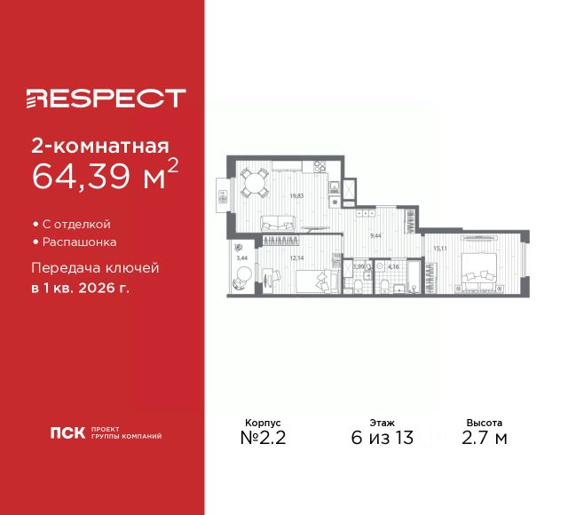 Продается двухкомнатная квартира с отделкой в ЖК "RESPECT" на 6 этаже. Общая площадь: 68.84 кв.м., жилая: 27.97 кв.м., площадь просторной кухни-столовой: 16.08 кв.м. Квартира - распашонка, без проходных комнат, окна выходят на paзные стороны дома. В квартире одна лоджия, один совмещенный и один раздельный санузел. Высота потолков 2.7 м.