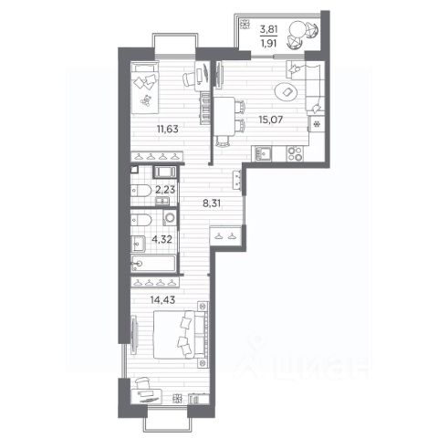 Санузел: раковина с тумбой, ванна или душевая кабина, унитаз, смесители. Выполнена полная разводка электропроводки.