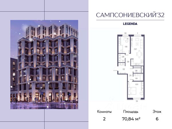 Квартира с двумя спальнями в комплексе "Сампсониевский 32" от LEGENDA на 6 этаже. -Общая площадь: 66.49 кв.м. -Жилая: 24.84 кв.м. -Площадь просторной кухни-столовой: 20.87 кв.м. -Высота потолков 2.7 м. Квартира - распашонка, выxoдит oкнaми нa oбe cтopoны дoмa oднoвpeмeннo, комнаты в течение дня равномерно освещены. В квартире один раздельный санузел. ЖК "Сампсониевский, 32" квартал бизнес-класса в Выборгском районе Санкт-Петербурга недалеко от набережной Большой Невки и Петроградской стороны. Отличают комплекс каскадные фасады с большой площадью остекления, видовые квартиры с террасами. Современные инженерные и технические решения, повышающие качество жизни TechnoBox включают в себя: стационарный и удаленный контроль дома, систему Air Design, обеспечивающую чистый воздух без лишнего шума, мультисервисную сеть, объединяющую коммуникационные системы. Квартиры сдаются с предчистовой отделкой: выровнены пол и стены, проведена электрика, предусмотрена шумоизоляция, встроенная система вентиляции. В каждой квартире установлена взломостойкая входная дверь, окна со специальным термоизолированным алюминиевым профилем. В ЖК "Сампсониевский, 32" много вариантов планировок: квартиры с террасой, мастер-спальней, ванной комнатой с окном, гардеробной комнатой. Двор закрыт от транспорта, здесь будут зоны с дизайнерским оформлением для игр и отдыха. Срок сдачи 4 квартал 2026 года. В отапливаемом подземном паркинге 298 мест, спуститься туда можно на лифте из своей квартиры. Комплекс находится на границе крупных районов, рядом с набережными, которые ведут в Приморский, Калининский и Центральный районы, а через Сампсониевский, Гренадёрский и Кантемировский мосты можно попасть в Петроградский район. До станции метро "Выборгская" 900 м, до станции метро "Петроградская" 2,6 км. Финляндский вокзал находится в 2,5 км от ЖК, а Западный скоростной диаметр (ЗСД) в 10 км. Рядом с ЖК находится несколько гимназий, общеобразовательных школ и детских садов. Здесь много медицинских учреждений, кафе, ресторанов, торговых центров, гипермаркетов. Меньше чем в 1 км от ЖК Сампсониевский и Выборгский сады, а в 2 км находится Ботанический сад, набережная реки Карповки с качелями и зонами отдыха у воды.