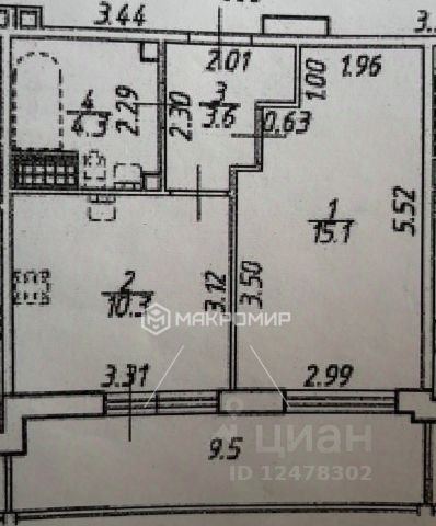 -Обустроенная кухня -10,3 кв.м. с выходом на большую застеклённую лоджию - 9,5 кв.м. и изолированной комнатой -15,1 кв.м. (гостиная).