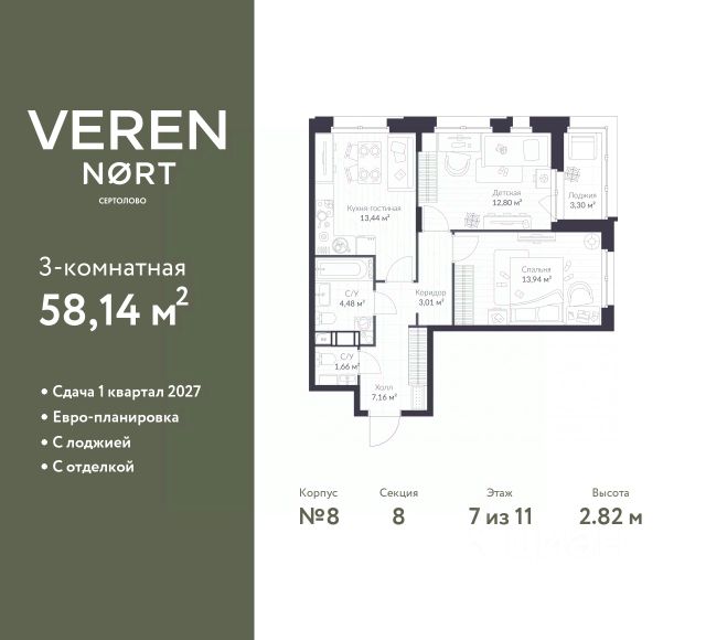 Продаётся e3 комнатная квартира (евро) в жилищном комплексе "Энфилд" (корпус Дом 18 секция 2). Общая площадь 60,45 кв. м, площадь комнат 10,87 кв.м, 13,74 кв.м. 2 санузла. Квартира расположена на 7 этаже 12 этажного дома. Срок сдачи корпуса IV квартал 2027 года. Современный жилой квартал "Энфилд" от компании Arsenal объединяет в себе преимущества хорошей экологии и удобного расположения рядом с городом. Квартал расположен на территории Мурино-Бугры, в 10 минутах от метро Девяткино. В состав ЖК "Энфилд" войдет 17 домов высотой до 12 этажей, 14 из них уже построено и сдано. На территории работает два детских сада и школа с углубленным изучением иностранных языков. Квартал славится красивой территорией, пешеходным бульваром с фонтанами, детскими и спортивными площадками, инфраструктурой для отдыха. В 5 минутах ходьбы расположен гипермаркет "Лента", из квартала предусмотрен удобный выезд на КАД.