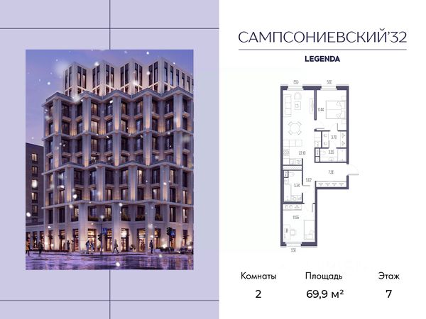 Квартира с двумя спальнями в комплексе "Сампсониевский 32" от LEGENDA на 7 этаже. -Общая площадь: 57.96 кв.м. -Жилая: 20.62 кв.м. -Площадь просторной кухни-столовой: 21.3 кв.м. -Высота потолков 2.7 м. Комнаты изолированные, все окна выходят на одну сторону. В квартире один совмещенный и один раздельный санузел. ЖК "Сампсониевский, 32" квартал бизнес-класса в Выборгском районе Санкт-Петербурга недалеко от набережной Большой Невки и Петроградской стороны. Отличают комплекс каскадные фасады с большой площадью остекления, видовые квартиры с террасами. Современные инженерные и технические решения, повышающие качество жизни TechnoBox включают в себя: стационарный и удаленный контроль дома, систему Air Design, обеспечивающую чистый воздух без лишнего шума, мультисервисную сеть, объединяющую коммуникационные системы. Квартиры сдаются с предчистовой отделкой: выровнены пол и стены, проведена электрика, предусмотрена шумоизоляция, встроенная система вентиляции. В каждой квартире установлена взломостойкая входная дверь, окна со специальным термоизолированным алюминиевым профилем. В ЖК "Сампсониевский, 32" много вариантов планировок: квартиры с террасой, мастер-спальней, ванной комнатой с окном, гардеробной комнатой. Двор закрыт от транспорта, здесь будут зоны с дизайнерским оформлением для игр и отдыха. Срок сдачи 4 квартал 2026 года. В отапливаемом подземном паркинге 298 мест, спуститься туда можно на лифте из своей квартиры. Комплекс находится на границе крупных районов, рядом с набережными, которые ведут в Приморский, Калининский и Центральный районы, а через Сампсониевский, Гренадёрский и Кантемировский мосты можно попасть в Петроградский район. До станции метро "Выборгская" 900 м, до станции метро "Петроградская" 2,6 км. Финляндский вокзал находится в 2,5 км от ЖК, а Западный скоростной диаметр (ЗСД) в 10 км. Рядом с ЖК находится несколько гимназий, общеобразовательных школ и детских садов. Здесь много медицинских учреждений, кафе, ресторанов, торговых центров, гипермаркетов. Меньше чем в 1 км от ЖК Сампсониевский и Выборгский сады, а в 2 км находится Ботанический сад, набережная реки Карповки с качелями и зонами отдыха у воды.