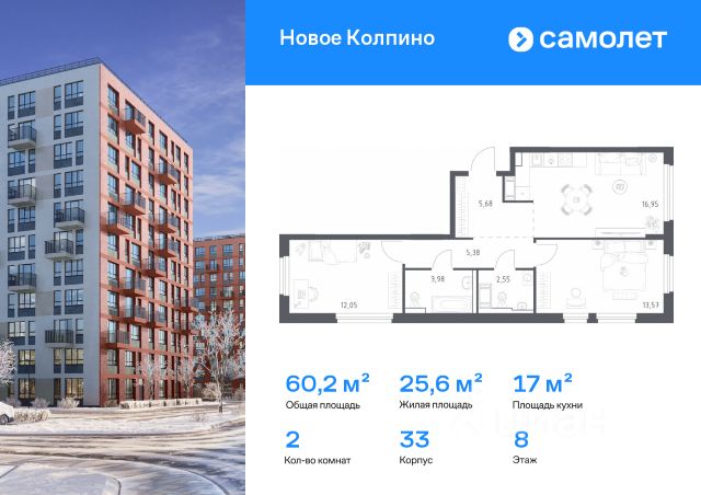 Строим кварталы для жизни с заботой о будущем. Предлагается 2-комнатная квартира комфорт-класса 56,09 кв.м в корпусе 33 на 8 этаже, в ЖК "Новое Колпино" Квартира с предчистовой отделкой. Доступность дополнительных опций уточняйте у застройщика. Приобрести квартиру возможно по специальным акциям от застройщика, с текущими условиями акций можно ознакомиться в блоке "Акций". Цена динамическая и может отличаться, уточняйте актуальность у застройщика. Квартал "Новое Колпино" — современный квартал в тихом и зеленом районе Санкт-Петербурга. Здесь можно подолгу любоваться пышными кронами деревьев, подставляя лицо теплым лучам солнца. А еще в любой момент можно сесть в машину и уже через час оказаться в сердце Северной столицы. Будет легко планировать поездки: до центра Петербурга, или площади Восстания, — 25 минут на поезде. С территории квартала удобно выезжать на крупные магистрали: путь до Южного шоссе займет 15 минут на авто, а до Петрозаводского шоссе — всего 6 минут. В 20 минутах на авто находится метро "Рыбацкое", а в 7 минутах — ж/д станция Колпино. Проводите выходные на природе в Колпинском парке, который находится недалеко от квартала, на берегу реки Ижоры. Летом здесь можно вместе с детьми веселиться на аттракционах, кататься на лодке, играть в бадминтон или волейбол. А еще можно захватить орехов и покормить белок. Всего 7 минут на авто или автобусе — и вы в центре города Колпино. Взрослых впечатлит русская архитектура старинных церквей, а детям понравится забавный памятник героям мультфильма "Трое из Простоквашино". В "Новом Колпино" будут работать 4 детских сада, 3 из них уже готовы встречать малышей. Ребята постарше могут ходить на занятия в школу с собственным бассейном, в проекте уже работает новая современная школа с бассейном Корпуса высотой 11 этажей с французскими и панорамными балконами отделаны штукатуркой и облицовочным кирпичом. Вдохновение для палитры нам подарили оттенки рассветного неба: терракотовый, персиковый, песочный. Во дворе найдется интересное занятие для всех жителей квартала. Взрослые смогут устраивать тренировки на свежем воздухе в спортивных зонах, дети будут целый день веселиться на игровых площадках. А еще мы позаботились о вашей безопасности и закрыли дворы от машин. Возвращайтесь домой с чемоданом из путешествия или коляской из парка. На пути в подъезд вы не встретите ступенек. Оставить транспорт можно будет в специальном помещении на первом этаже. По желанию вы сможете получить ключи от квартиры с готовой отделкой. Мы положим ламинат, поклеим обои, установим мебель и сантехнику. Доступен вариант с готовой кухней — бежевые тона отделки станут фоном для интерьера мечты. Чтобы сразу отпраздновать новоселье, закажите у нас декор и мебельные сеты. А если хочется воплотить собственные идеи в интерьере, присмотритесь к опции — без отделки.