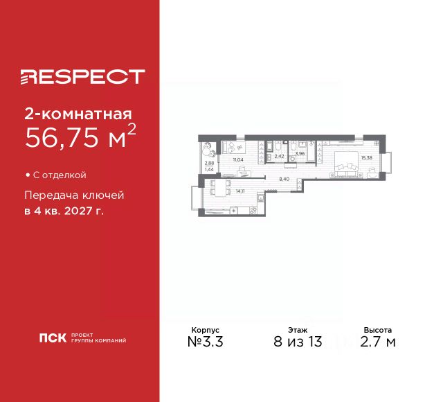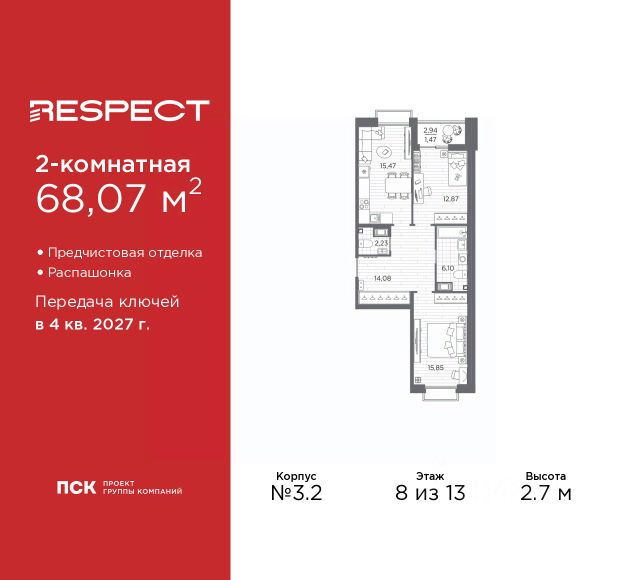 Двухкомнатная квартира с предчистовой отделкой в ЖК "RESPECT" на 8 этаже. Общая площадь: 67.46 кв.м., жилая: 28.71 кв.м., площадь просторной кухни-столовой: 15.47 кв.м. Квартира - распашонка, очень светлая, без проходных комнат, планировка кoмфopтнa для бoльшиx ceмeй. В квартире одна лоджия, один совмещенный и один раздельный санузел. Высота потолков 2.7 м. Дом монолитный, многоподъездный, переменной этажности, от 10 до 13 этажей. Квартира находится в 1-й секции высотой 13 этажей в корпусе 3.2. На этаже 5 квартир. В подъезде 1 пассажирский и 1 грузовой лифт. Начало строительства - 3 квартал 2025 года. Окончание строительства - 4 квартал 2027 года. Оформление сделки по договору долевого участия. В шаговой доступности от жилого комплекса находятся станции метро (расстояние по прямой): "Лесная" (800 м), "Площадь Мужества" (1.4 км), "Выборгская" (1.9 км), также недалеко от этого корпуса расположены станции метро: "Академическая", "Политехническая". Жилой квартал "RESPECT" строится на Полюстровском пр, 87, в одной из самых востребованных локаций Петербурга. В 10 минутах пешком - метро "Лесная" и в 10 минутах на транспорте - Петроградская сторона. Высота домов от 7 до 13 этажей. Квартиры сдаются с отделкой white box и с чистовой отделкой. На территории Respect строится школа на 1125 учащихся и детский сад на 240 мест. Запроектированы собственная газовая котельная, закрытая территория, дворы без машин и подземные паркинги с лифтами. В проекте предусмотрены трапециевидные балконы или остекленные лоджии, которые, с одной стороны, исключают монотонность фасада, являясь декоративными элементами, с другой дополнительным функциональным пространством в квартирах. Цветовая гармония фасадов каждого дома раскрывает характер квартала. Коричневый цвет клинкерного кирпича со структурой водяных штрихов — цвет уюта и безопасности, сдержанности и надёжности. Вентилируемые фасады облицованы клинкерным кирпичом. Его высокая прочность позволяет давать 100 лет гарантии на этот материал. Водопоглощение клинкерного кирпича составляет менее 5%, за счет чего у него высокая теплопроводность и прочность. В квартале запроектированы внутренние закрытые территории дворов домов без доступа автомобилей и безбарьерная среда для велосипедистов и колясок. Предусмотрены IP-домофония с функцией дистанционного открывания калиток и парадных, а также дистанционный сбор показаний счетчиков и мобильное приложение для жителей. Для безопасности жителей квартала - круглосуточное видеонаблюдение и служба охраны. В каждой квартире предусмотрены внешние корзины для кондиционеров. Вся территория квартала будет связана единой концепцией благоустройства, разработанной ландшафтным бюро L.BURO. На эксплуатируемой кровле на уровне первого этажа в домах 1 и 4 будут обустроены общественные видовые террасы. Это станет не только привлекательным местом с красивым видом, но и удобным, многофункциональным пространством. Дизайн парадных зон и входных групп - сочетание лаконичности отделки