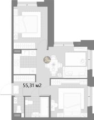 Просторная кухня-гостиная 15,41 м², светлая спальня 9,47 м², уютная детская 12,57 м², гардеробная комната 3,6 м², а также раздельный санузел 3,7 м² + 2,65 м²