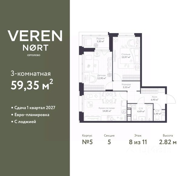 Продаётся e3 комнатная квартира (евро) в жилищном комплексе "Энфилд" (корпус Дом 18 секция 2). Общая площадь 60,45 кв. м, площадь комнат 10,87 кв.м, 13,74 кв.м. 2 санузла. Квартира расположена на 8 этаже 12 этажного дома. Срок сдачи корпуса IV квартал 2027 года. Современный жилой квартал "Энфилд" от компании Arsenal объединяет в себе преимущества хорошей экологии и удобного расположения рядом с городом. Квартал расположен на территории Мурино-Бугры, в 10 минутах от метро Девяткино. В состав ЖК "Энфилд" войдет 17 домов высотой до 12 этажей, 14 из них уже построено и сдано. На территории работает два детских сада и школа с углубленным изучением иностранных языков. Квартал славится красивой территорией, пешеходным бульваром с фонтанами, детскими и спортивными площадками, инфраструктурой для отдыха. В 5 минутах ходьбы расположен гипермаркет "Лента", из квартала предусмотрен удобный выезд на КАД.