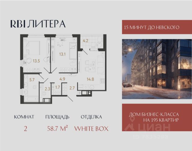 Цена действует при 100% оплате и на определенные ипотечные программы. Подробности — в отделе продаж по телефону. Продаётся 2-комнатная квартира в ЖК "Цивилизация на Неве" на 8 этаже. Общая площадь составляет 59.17 кв. м. Квартира с white box отделкой. Жилой комплекс "Цивилизация на Неве" располагается по адресу Санкт-Петербург, Невский. "Цивилизация на Неве" - видовые дома бизнес-класса, расположенные вдоль набережной Невы, всего в 7 км от исторического центра. Жилой комплекс идеально выражает особый дух, свойственный знаменитым просторным кварталам постройки сталинской эпохи в Москве и на Московском проспекте в Петербурге. Расположение: • 15 мин на авто до Невского проспекта; • 15 мин на авто до Московского вокзала; • 5 мин на авто до станции метро "Улица Дыбенко"; • 14 мин (7 км) до КАД. Уникальный дизайн входных зон, закрытая территория, видеонаблюдение и охрана, подземный паркинг с лифтом и другие особенности проекта отвечают заявленному классу. В каждом дворе предусмотрено озеленение по индивидуальному ландшафтному проекту с благородными растениями и кустарниками. Преимущества: • Закрытая территория с видеонаблюдением; • Подземный паркинг с лифтом; • Детская площадка на приватной безопасной территории; • Несколько детских садов и школ; • Инфраструктура шаговой доступности на первых этажах корпусов. Успейте приобрести квартиру на выгодных условиях! Чтобы узнать подробности, обращайтесь за консультацией по телефону.