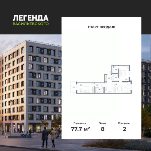Двухкомнатная квартира с предчистовой отделкой в ЖК "ЛЕГЕНДА Васильевского" на 8 этаже. Общая площадь: 54.73 кв.м., жилая: 20.13 кв.м., площадь просторной кухни-столовой: 20.19 кв.м. Угловая квартира, очень светлая, естественная вентиляция при открытии окон. В квартире один раздельный санузел. Высота потолков 2.72 м. "ЛЕГЕНДА Васильевского" жилой квартал в минутной доступности от Финского залива, главного креативного хаба Санкт-Петербурга Севкабель Порта и других точек притяжения. Современные инженерные и технические решения, повышающие качество жизни TechnoBox включают в себя: стационарный и удаленный контроль дома, систему вентиляции Air Design - здоровое дыхание без лишнего шума, мультисервисную сеть, объединяющую коммуникационные системы, удаленное управление электроприборами, контроль отопления в каждом помещении, поддерживающий оптимальный температурный баланс во время "холодного" периода", датчики протечки, датчик открытия входной двери. Мультисервисная сеть (МСС) объединяет ключевые слаботочные системы дома, задавая им единый высокий стандарт работы, обеспечивая надёжность их функционирования и управления. Квартира готова к декорированию. Застройщиком сделана шумоизоляция; стены подготовлены для отделки; проведена электрика с учетом рекомендаций по расстановке мебели и бытовой техники; выровнен пол. В каждой квартире установлена взломостойкая входная дверь, окна со специальным термоизолированным алюминиевым профилем. Двор жилого комплекса "ЛЕГЕНДА Васильевского" закрыт. Проект состоит из шести разноформатных корпусов с ритмичными фасадами в духе пост-конструктивизма. Геометрия жилого комплекса состоит из четко простроенных осей, чередующих открытые пространства и объемы корпусов, каждый из которых обладает своим визуальным кодом индивидуальным рисунком фасада и цветовой палитрой. Корпуса образуют периметр с общественными пространствами: площадью с кафе, магазинами и пешеходным променадом с детскими игровыми хабами, местами для спокойного отдыха и workout-зоной. На территории комплекса предусмотрены теплый подземный паркинг и два наземных 4-х этажных паркинга.