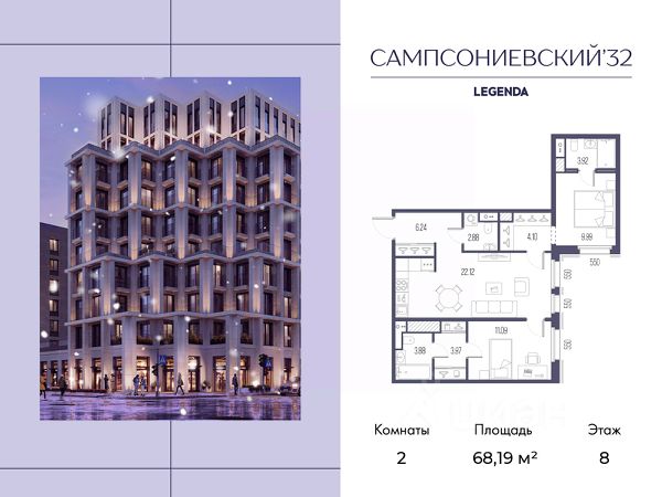 Квартира с двумя спальнями в комплексе "Сампсониевский 32" от LEGENDA на 8 этаже. -Общая площадь: 68.19 кв.м. -Жилая: 21.08 кв.м. -Площадь просторной кухни-столовой: 22.12 кв.м. -Высота потолков 2.7 м. Комнаты изолированные, все окна выходят на одну сторону. В квартире один совмещенный и один раздельный санузел. ЖК "Сампсониевский, 32" квартал бизнес-класса в Выборгском районе Санкт-Петербурга недалеко от набережной Большой Невки и Петроградской стороны. Отличают комплекс каскадные фасады с большой площадью остекления, видовые квартиры с террасами. Современные инженерные и технические решения, повышающие качество жизни TechnoBox включают в себя: стационарный и удаленный контроль дома, систему Air Design, обеспечивающую чистый воздух без лишнего шума, мультисервисную сеть, объединяющую коммуникационные системы. Квартиры сдаются с предчистовой отделкой: выровнены пол и стены, проведена электрика, предусмотрена шумоизоляция, встроенная система вентиляции. В каждой квартире установлена взломостойкая входная дверь, окна со специальным термоизолированным алюминиевым профилем. В ЖК "Сампсониевский, 32" много вариантов планировок: квартиры с террасой, мастер-спальней, ванной комнатой с окном, гардеробной комнатой. Двор закрыт от транспорта, здесь будут зоны с дизайнерским оформлением для игр и отдыха. Срок сдачи 4 квартал 2026 года. В отапливаемом подземном паркинге 298 мест, спуститься туда можно на лифте из своей квартиры. Комплекс находится на границе крупных районов, рядом с набережными, которые ведут в Приморский, Калининский и Центральный районы, а через Сампсониевский, Гренадёрский и Кантемировский мосты можно попасть в Петроградский район. До станции метро "Выборгская" 900 м, до станции метро "Петроградская" 2,6 км. Финляндский вокзал находится в 2,5 км от ЖК, а Западный скоростной диаметр (ЗСД) в 10 км. Рядом с ЖК находится несколько гимназий, общеобразовательных школ и детских садов. Здесь много медицинских учреждений, кафе, ресторанов, торговых центров, гипермаркетов. Меньше чем в 1 км от ЖК Сампсониевский и Выборгский сады, а в 2 км находится Ботанический сад, набережная реки Карповки с качелями и зонами отдыха у воды.