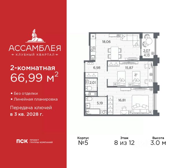 Просторная 2-комн. квартира в Клубный квартал "Ассамблея" на 8 этаже. Квартира без отделки, после оформления собственности можно делать ремонт. Общая площадь: 76.2 кв.м., жилая: 32.8 кв.м., площадь просторной кухни-столовой: 20.59 кв.м. Квартира - распашонка, без проходных комнат, окна выходят на paзные стороны дома. В квартире одна лоджия, один совмещенный и один раздельный санузел. Высота потолков 3.0 м. Дом монолитный, трехподъездный, высотой 12 этажей. Квартира находится в 1-й секции в корпусе 4. На этаже 5 квартир. В подъезде 1 пассажирский и 1 грузовой лифт. Начало строительства - 3 квартал 2025 года. Окончание строительства - 3 квартал 2028 года. Оформление сделки по договору долевого участия. В шаговой доступности от жилого комплекса имеются станции метро (расстояние по прямой): "Горный институт" (1.0 км), "Василеостровская" (1.4 км), "Приморская" (1.5 км), также недалеко от этого корпуса расположены станции метро: "Спортивная", "Чкаловская". "Клубный квартал Ассамблея" — проект бизнес-класса на Васильевском острове, в самом сердце исторического Петербурга. Комплекс состоит из пяти корпусов переменной этажности — от 7 до 12 этажей — с выразительной архитектурой в стиле неомодернизма: светлый клинкер, панорамное остекление, просторное лобби с потолками высотой почти 8 метров. Потолки — до 3,2 метров. Подземный паркинг на 667 машиномест. Комфорт и инфраструктура Проект ориентирован на комфортную городскую жизнь. В закрытом дворе — ландшафтное озеленение, современные детские и спортивные площадки. Внутренний клуб для резидентов включает коворкинг, переговорные, кинозал, фитнес и бьюти-зону. IP-домофония с просмотром камер видеонаблюдения, дистанционное открывание дверей и доступа на территорию и в парадную со смартфона и планшета, просмотр показаний счетчиков, приложение для жителей PSK Home. Локация Расположение на Васильевском острове — сильная сторона проекта. До четырех станций метро ("Горный институт", "Василеостровская", "Спортивная", "Приморская") — 515 минут пешком. В шаговой доступности — зелёные зоны, культурные учреждения, в том числе сад "Василеостровец" и ДК имени Кирова. Основные магистрали Большой, Средний и Малый проспекты, Наличная и Уральская улицы. Съезд на ЗСД расположен недалеко от станции метро "Приморская", близ береговой линии. Благовещенский и Дворцовый мосты соединяют остров с центром города, а мосты Тучков, Биржевой и Бетанкура — с Петроградской стороной. Застройщик Группа компаний ПСК является одной из ведущих девелоперских компаний Санкт Петербурга. На протяжении 18 лет она возводит в Северной столице качественное жилье премиум, бизнес и комфорт-класса, социальные объекты школы и детские сады, апарт-отели и торговые центры. Является шестикратным обладателем золотого знака "Надежный застройщик России". #2MbgoA