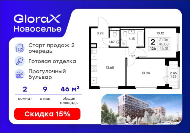 Продаётся 2-комн. квартира площадью 54,43 кв.м на 9 этаже 12 этажного дома (Корпус 4.1, Секция 2) проекта ПИК Таллинский парк. Светлый просторный подъезд на уровне земли, функциональная планировка, большие окна, c отделкой. "Таллинский парк" - проект в Ленинградской области, в районе Новоселье. До станции метро "Проспект Ветеранов" - 15 минут на автомобиле, а до КАД можно доехать всего за 4 минуты. "Таллинский парк" включает 16 жилых домов, детский сад и школу. В проекте появится центральный сквер с обильным озеленением, а через весь квартал протянутся широкие пешеходные бульвары. В зелёных дворах-парках будут оборудованы современные детские и спортивные площадки, обустроены места для отдыха. На первых этажах разместятся магазины, кафе и другие сервисы. Проектом предусмотрены персональные кладовые помещения - это доступный, экономичный и удобный способ хранения сезонных и крупногабаритных вещей. Освободите свою квартиру для полноценной жизни. Район Новоселье активно развивается в городском формате: здесь уже работают детские сады, школа и магазины. Для любителей зимних видов спорта открыта круглосуточная ледовая арена Ice Rink. За покупками и развлечениями также можно быстро доехать: 10 минут - и вы в Аутлете Fashion House Таллинское, гипермаркетах Лента, Леруа Мерлен и Окей. В 10 минутах на автомобиле находится Финский залив, на берегу которого расположились объекты культурного наследия. Рядом - Константиновский парк с отреставрированным дворцом, а чуть дальше расположена усадьба Знаменка. В великолепном Петергофе вы будете уже через 20 минут. Артикул 1026451 (Застройщик ООО "СПЕЦИАЛИЗИРОВАННЫЙ ЗА СТРОЙЩИК "СТРОЙ-ЭКСПЕРТ ") [cn_sbp_1836341]