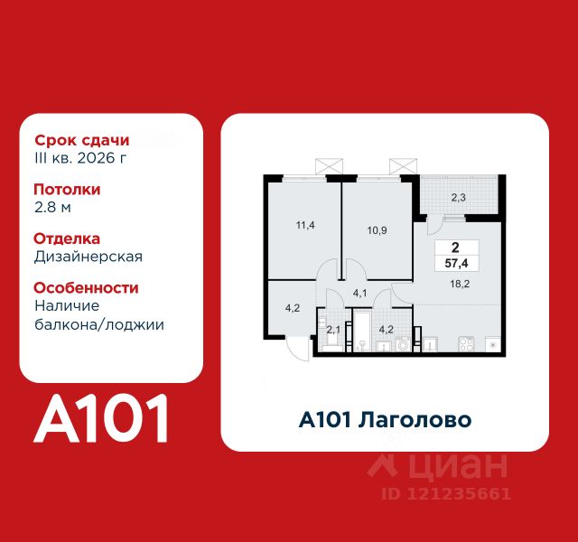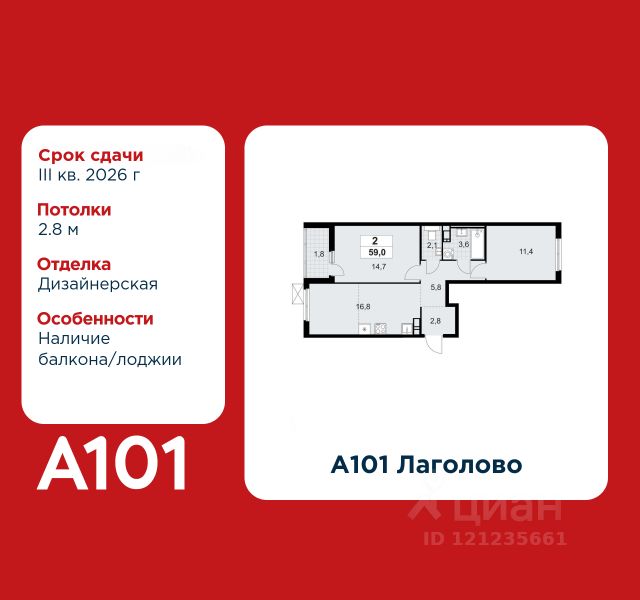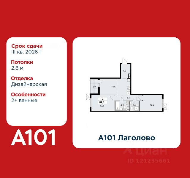 2-комнатная квартира площадью 46.40 в ЖК "А101 Лаголово" c лоджией на 9 этаже. Квартира с отделкой. Вид из окна во двор. В квартире 1 санузел. Высота потолков 2.8 м. Предложения от застройщика на декабрь 2025: - Гибкая рассрочка 20 000 руб/мес. и первым взносом 10%. ОТДЕЛКА Для квартир с чистовой отделкой предлагается три варианта дизайна: Классика, Карелия светлая и Карелия темная. Варианты всех дизайнерских решений представлены на фотографиях. Подробности можно уточнить у менеджера. На все отделочные работы от застройщика предоставляется гарантия. ОСОБЕННОСТИ ПЛАНИРОВКИ Глубокая лоджия от 1,4м позволяет организовать отдельный кабинет, мастерскую или зимний сад с лаундж-зоной. ПАРАДНАЯ В каждой парадной предусмотрены места для хранения велосипедов и колясок, гостевой санузел, лапамойка (место для мытья домашних животных или колес велосипедов) и удобная зона ожидания для гостей. ДВОРЫ И ОКРУЖЕНИЕ Просторные дворы свободны от машин и закрыты от посторонних. Большую часть комплекса займут благоустроенные зелёные зоны, теневые сады и городские общественные пространства с развитой тротуарной сетью и велодорожками. Каждый дом оборудован системами видеонаблюдения и контроля доступа. "А101 Лаголово" - современный город у подножия знаменитых Дудерговских высот, в объятиях чистейших озёр и зелёных живописных массивов, наполненный всем необходимым для счастливой жизни. ИНФРАСТРУКТУРА. Мы занимаемся комплексным освоением территории. Наш приоритет - доступность всех сервисов для счастливой жизни. 1. Лаголово-город 15-ти минутной доступности. Вся необходимая инфраструктура: магазины, салоны красоты, образовательные учреждения, медицинские центры находятся в 15-ти минутах пешей прогулки от любой точки жилого комплекса. Это позволяет не тратить время на долгие перемещения. 2. Представьте идеальный город, где ребенок может спокойно играть, а пожилой человек наслаждаться заслуженным отдыхом. Жилая среда нашего комплекса может комфортно использоваться как 8-летним ребенком, так и 80-летним пожилым человеком. Дома, улицы, общественные пространства, тротуары спроектированы с заботой о людях разных возрастов. 3. Мы активно развиваем авторскую образовательную экосистему "Лёрнити". Она включает строительство 8 современных детских садов (2000 мест) и 3 школ (2945 учащихся). Мы учим родителей гармонично общаться с детьми, помогаем малышам подготовиться к школе, а подросткам - выбрать будущую профессию и развить таланты. Не хватает средств на покупку кладового помещения? Оформите ипотеку на квартиру и добавьте к ней часть стоимости кладовой. ЗАСТРОЙЩИК ГК "А101" - крупный инвестиционно-строительный холдинг, занимает 6-е место по объему строительства в России (по данным "Единого ресурса застройщиков" на 2023 год). НКР присвоило ГК "А101" кредитный рейтинг A+.ru, подтверждая его надежность и финансовую устойчивость для завершения строительства ЖК.