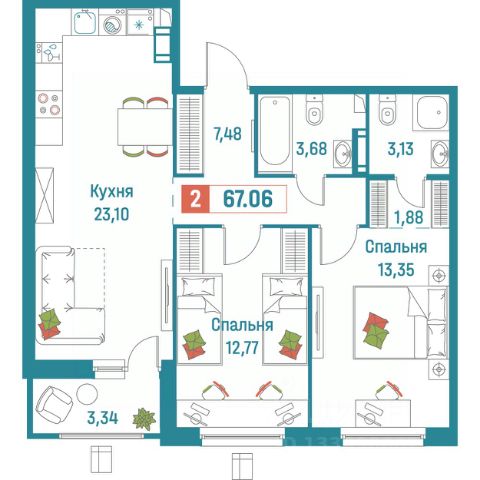 Просторная и функциональная квартира формата евро-3 , общая площадь — 64,29 м² (по ЕГРН + лоджия 4.3 м²) :