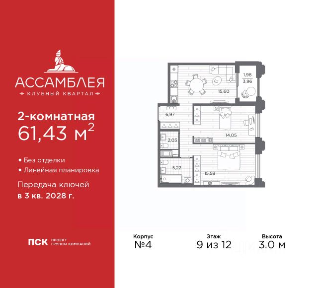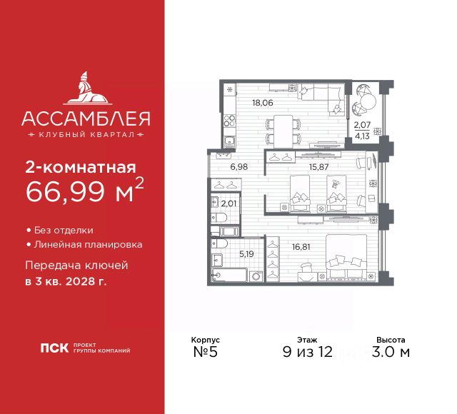 В квартире выполнен качественный ремонт из дорогостоящих материалов, уникальной особенностью квартиры является просторная гостиная 26,9 кв.м. асимметричной формы с тремя окнами, уютная спальня 16,1 кв.м. обустроена двумя большими встроенными шкафами, кухня оборудована всей необходимой мебелью и техникой, вместительная прихожая 6,1 кв.м., 2 совмещенных санузла, выделенная постирочная зона, большая застекленная лоджия. Квартира полностью укомплектована, мебель и техника, входят в стоимость квартиры.