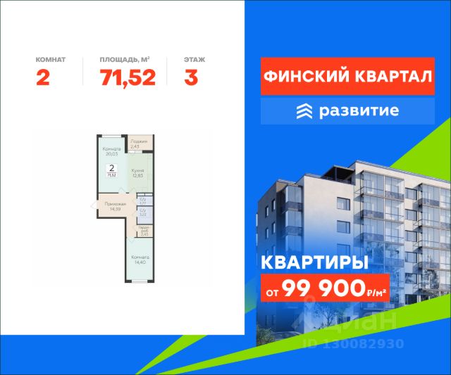 Продается квартира площадью 56.05 кв. м без отделки. Квартира расположена на 3 этаже 8 этажного дома, в жилом комплексе комфорт-класса "Финский Квартал". "Финский квартал" - это уникальный проект комфорт-класса для тех, кто хотел бы жить на природе, но при этом находиться вблизи Северной столицы. Расположенный в окружении одного из самых крупных парков Ленобласти - Лахтинского, проект предлагает своим жителям доступную инфраструктуру, комплексное благоустройство территории, 6 секций переменной этажности с современной архитектурой, которая гармонично дополнит район и будет радовать проживающих еще много лет. Найдите свою идеальную квартиру в ЖК "Финский Квартал"! Расположение Пешком: - 5 мин. до детского сада и супермаркета; - 8 мин. до остановки "Зеленая улица"; - 10 мин. до лесопарковой зоны. На автомобиле: - 3 мин. до Приозерского шоссе; - 10 мин. до Выборгского шоссе; - 12 мин. до КАД; - 30 мин. до ст. метро "Проспект Просвещения". Благоустройство - большой яркий двор с ландшафтным дизайном; - живая изгородь, кустарники и хвойники; - умное зонирование тихих и активных площадок; - сквер для прогулок и отдыха; - изумрудные лужайки для пикников; - дорожки для пешеходов и велосипедистов; - большие игровые площадки; - мягкое покрытие для безопасности детей; - тренажеры, турники и веревочные комплексы; - пространство только для пешеходов - без машин; - наземная парковка за пределами двора; - специальные площадки для выгула питомцев; - светлые дизайнерские холлы; - светопрозрачное остекление и большие окна; - декоративная подсветка парадных; - колясочные помещения для комфорта родителей; - места для хранения велосипедов и самокатов. Окружение - свежий воздух: парк усадьбы "Осиновая Роща", Лахтинский парк, лесопарк "Курортный", Левашовский заказник, Ново-Кавголовский лесопарк; - водные объекты: Сестрорецкий Разлив, пляжи у Тохколодского и Большого озер, залив Сярюнлахти; - инфраструктура: 2 детских сада, школа, кафе, продуктовый супермаркет, больница; - для крупных покупок: ТРЦ "Китай-Город", "Мега-Парнас"", "Гранд Каньон"; - активный отдых: горнолыжные комплексы "Охта-Парк" и "Токсово", конный клуб "Осиновая Роща", ФОК "Норус". 2-комнатная квартира в ипотеку в сельском поселении Юкковское Всеволожского района.