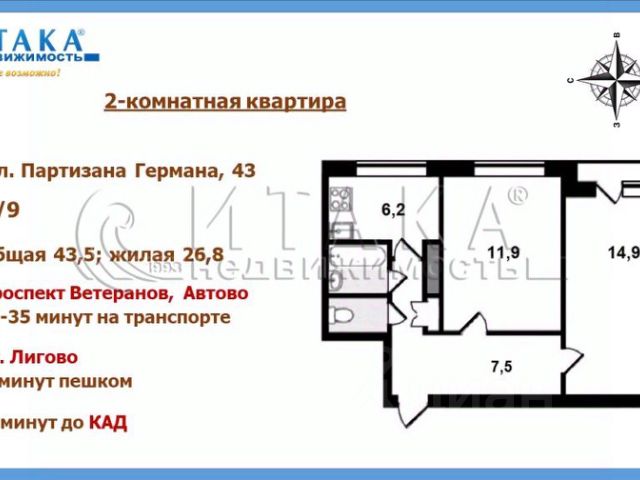 Комнаты: 2 изолированные (11,9 м² и 14,9 м²)