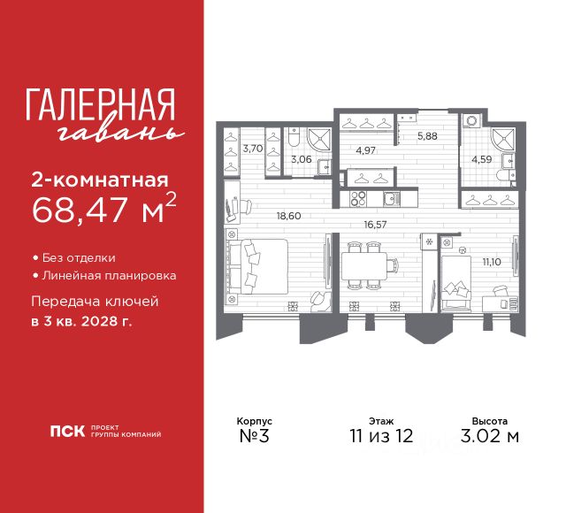 2-комн. квартира в ЖК "Галерная гавань" на 3 этаже. Квартира без отделки, после выдачи ключей можно делать ремонт. Общая площадь: 60.85 кв.м., жилая: 29.04 кв.м., площадь просторной кухни-столовой: 14.04 кв.м. Комнаты изолированные, все окна выходят на одну сторону. В квартире два совмещенных санузла. Высота потолков 3.02 м. Дом монолитный, трехподъездный, высотой 12 этажей. Квартира находится в 6-й секции в корпусе 3. На этаже 7 квартир. В подъезде 1 пассажирский и 1 грузовой лифт. Начало строительства - 4 квартал 2025 года. Окончание строительства - 3 квартал 2028 года. Оформление сделки по договору долевого участия. В шаговой доступности от жилого комплекса имеется станция метро (расстояние по прямой) "Приморская" (1.6 км), также недалеко от этого корпуса находятся станции метро: "Горный институт", "Василеостровская", "Спортивная", "Крестовский остров". "Галерная гавань" — это жилой комплекс бизнес-класса в исторической части Васильевского острова — на берегу Галерной гавани, ведущей свою историю с 1724 года. В свою очередь, исторический Васильевский остров это университеты, школы, детские сады, поликлиники, несколько станций метро и прочая инфраструктура без проблем с транспортной доступностью. В "Галерной гавани" шесть корпусов на 813 квартир, площадью от 29,5 до 134 кв.м. Высота потолков 3 м. Два корпуса из шести всего на 20 квартир. На верхних этажах расположатся квартиры с большими террасами и панорамным остеклением. Также есть квартиры с французскими балконами и мастер-спальнями. Четыре квартиры из каждых пяти с видами из окон на тихую воду, на старые и новые городские символы. Паркинг займет весь подземный объем квартала, и будет вмещать 606 автомобилей. Фасады "Галерной гавани" выполняются в стиле баварской кирпичной кладки, с акцентами из керамогранита графитового оттенка. Объемы задаются ризалитами с художественной подсветкой. Для жителей будет создан комьюнити-клуб с переговорной и библиотекой, кинозалом, кофе-поинтом, детской комнатой с пространством для мастер-классов, фитнес-зоной, а также бьюти-кабинетом. "Галерная гавань" — это также первый в Петербурге жилой комплекс с общественным пространством у воды. ГК "ПСК" восстановит десять исторических зданий, в которых расположатся рестораны, кафе, фитнес-клуб с бассейном, культурное пространство, театр и офисы. При этом набережная будет превращена в пешеходную, в территорию общественного пространства. #z6CcBd