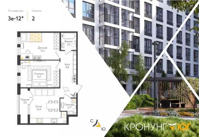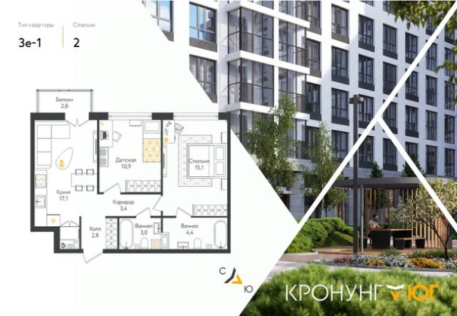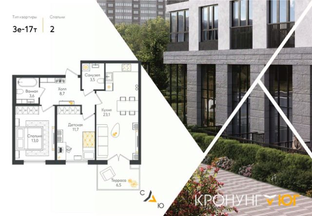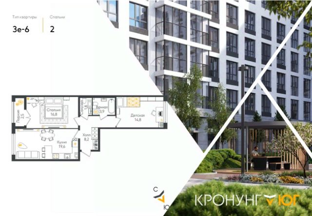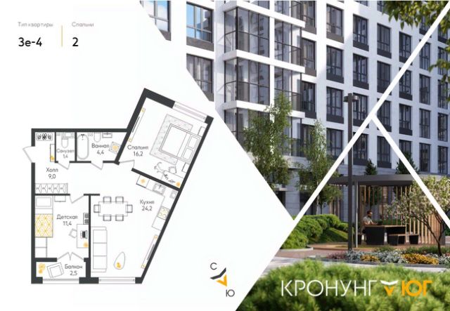 Большой холл, вид на внутренний двор . Кронунг ЮГ- современный жилой комплекс комфорт-класса на берегу реки Дудергофки. Невысокая этажность, современная архитектура. Благоустроенный внутренний двор будет включать в себя спортивные площадки, в том числе памп-трек, места для отдыха, прогулочную набережную, детские игровые площадки, места для выгула собак, шезлонги вдоль берега реки Дудергофки. Для автомобилей предусмотрен трехэтажный отдельно стоящий паркинг и парковочные места с зарядными станциями для электромобилей на территории ЖК. Локация: • 1 минута до автобусной остановки • 20 минут до метро • 5 минут до КАД