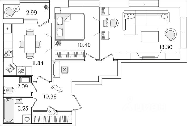 • Гостиная: просторная и светлая, площадью 18,7 кв.м, идеально подходит для семейных встреч и отдыха.