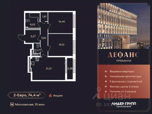 Ваша квартира — это идеально продуманное пространство: - ВИДОВАЯ СТОРОНА — из ваших окон открываются прекрасные виды на город. - ДВЕ ЛОДЖИИ, ОДНА ИЗ НИХ ИЗ КУХНИ ПЛОЩАДЬЮ 5,1 М² — дополнительное пространство для утреннего кофе или вечерних игр с детьми. - УДОБНАЯ НИША ПОД ШКАФ ПРИ ВХОДЕ — сразу решает вопрос с хранением вещей. - БОЛЬШАЯ КУХНЯ-ГОСТИНАЯ 20,3 М² — идеальное место для семейных обедов, приёмов гостей и создания уютной атмосферы. - ДВА ОКНА В КУХНЕ-ГОСТИНОЙ — многократно усиливают ощущение простора. - ПАНОРАМНЫЕ ОКНА В ПОЛ — дарят квартире максимальное количество света и открывают прекрасные виды. - ДВА САНУЗЛА — ключевое удобство для совместного проживания. - КВАРТИРА НА ДВЕ СТОРОНЫ — открываются виды на благоустроенный двор и на город. - ПОСЛЕДНИЙ ЭТАЖ (нет соседей сверху) — гарантирует вам максимальную тишину и уединение, которых так не хватает в городе А также в составе проекта есть собственный театр с новейшей акустической системой, кинооборудованием, теннисный корт и фитнес-центр площадью 2700 кв. м с двумя бассейнами и зоной СПА. Всё это — в шаговой доступности. ЖК "Дефанс Бизнес" — это воплощение современного комфорта и высоких стандартов петербургской архитектуры. Элегантный дом в виде замкнутого каре с архитектурной подсветкой карниза расположился в комфортном удалении от оживлённой ул. Типанова, всего в 10 минутах ходьбы от Московской площади и станции метро "Московская". Приватная территория ЖК закрыта от посторонних и машин, здесь разместился уютный двор с зонами для игр, отдыха и арт-объектом "Солнечный парус". Променад, пять фонтанов с подсветкой и таинственный сад делают этот проект местом, где хочется жить любому успешному петербуржцу! ЖК "Дефанс Бизнес" предлагает просторные кухни-гостиные, новейшие инженерные системы, дизайнерские холлы и консьерж-сервис. Дом сдан. Успейте купить по выгодной цене!