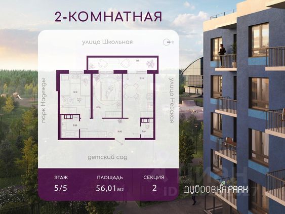 Продается 2-комн. квартира, площадью 56.01 м2 в монолитно-кирпичной новостройке в 20 мин. транспортом от м.Улица Дыбенко. Возможен вариант покупки с использованием ипотечных средств, есть рассрочка. Жилая площадь 24.49 м2, кухня 12.9 м2. Площадь комнат: 12.3/12.19 м2, квартира без отделки. Раздельных санузлов - 1, балконов - 1, окна выходят на улицу. Квартира располагается на 5 этаже 5-этажного дома в ЖК Дубровка.Park. Застройщик - ЛенОблСтрой 47, сдача дома - III квартал 2026 года, высота потолков 2.72 м. Дом оборудован пассажирским лифтом. Парковка автомобилей - наземная Жилой комплекс "Дубровка.Park" это современный монолитно-кирпичный комплекс от застройщика ГК "ЛенОблСтрой 47", расположенный в живописном поселке Дубровка Ленинградской области по адресу: Школьная улица, 2. Комплекс сочетает в себе комфорт городской жизни и прелести загородной природы. Квартиры с разнообразными планировками предлагаются как с чистовой, так и с предчистовой отделкой. Высота потолков 2.72 м. Окна выходят во двор и на улицу, обеспечивая оптимальное освещение и вид. Ввод в эксплуатацию запланирован на 3 квартал 2026 года (ожидается досрочная сдача объекта). Каждый дом оснащен лифтами, предусмотрена наземная парковка. Создана безбарьерная среда с пандусами. Архитектура комплекса выполнена в современном стиле с использованием экологичных материалов, гармонично вписанных в окружающий ландшафт. На территории расположены детские и спортивные площадки, зоны отдыха с озеленением, газонами, деревьями и кустарниками, собственный выход в парк. В пешей доступности находятся детские сады, школы, поликлиники, магазины, рестораны и фитнес-центры. Прекрасная экология и близость парка делают "Дубровка.Park" идеальным местом для тех, кто ценит здоровую и активную жизнь. Удобная транспортная доступность позволяет быстро добраться до города. Экология, отличная транспортная доступность - сложно найти в Ленинградской области более комфортное место, чем Дубровка. Жить здесь престижно и безопасно, а добраться до города - вопрос получаса. Адрес проекта: Ленинградская область, г. п. Дубровка, Школьная ул., 2 Позвоните и узнайте условия покупки прямо сейчас!
