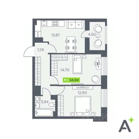 Планировка без лишних выступов и углов: в коридоре — место под полноценный шкаф, кухонная зона удобно расположена, остаётся много свободного пространства.