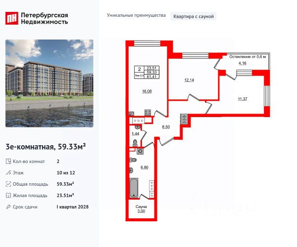 Цена действует при 100% оплате и на определенные ипотечные программы. Подробности — в отделе продаж по телефону. Продаётся 2-комнатная квартира в ЖК "Цивилизация на Неве" на 18 этаже. Общая площадь составляет 59.82 кв. м. Квартира с white box отделкой. Жилой комплекс "Цивилизация на Неве" располагается по адресу Санкт-Петербург, Невский. "Цивилизация на Неве" - видовые дома бизнес-класса, расположенные вдоль набережной Невы, всего в 7 км от исторического центра. Жилой комплекс идеально выражает особый дух, свойственный знаменитым просторным кварталам постройки сталинской эпохи в Москве и на Московском проспекте в Петербурге. Расположение: • 15 мин на авто до Невского проспекта; • 15 мин на авто до Московского вокзала; • 5 мин на авто до станции метро "Улица Дыбенко"; • 14 мин (7 км) до КАД. Уникальный дизайн входных зон, закрытая территория, видеонаблюдение и охрана, подземный паркинг с лифтом и другие особенности проекта отвечают заявленному классу. В каждом дворе предусмотрено озеленение по индивидуальному ландшафтному проекту с благородными растениями и кустарниками. Преимущества: • Закрытая территория с видеонаблюдением; • Подземный паркинг с лифтом; • Детская площадка на приватной безопасной территории; • Несколько детских садов и школ; • Инфраструктура шаговой доступности на первых этажах корпусов. Успейте приобрести квартиру на выгодных условиях! Чтобы узнать подробности, обращайтесь за консультацией по телефону.