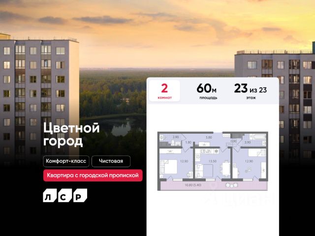 Цена действует при 100% оплате и на определенные ипотечные программы. Подробности — в отделе продаж по телефону. Продается 2-комнатная квартира в ЖК "Цветной город" на 25 этаже. Общая площадь составляет 38.60 кв. м. Квартира с чистовой отделкой Срок сдачи дома: 3 квартал 2026. Жилой комплекс "Цветной город" располагается по адресу Санкт-Петербург, Красногвардейский. "Цветной город" - современный масштабный эко-проект: жилые кварталы со своей сетью улиц, пешеходными бульварами и велодорожками, площадками для спорта и отдыха. Кварталы располагаются вдоль береговой линии реки Охты. "Цветной город" - это жизнь вблизи природы, но с городской пропиской. К 2026 году на берегах реки Охты будет создан Пейзажный парк с летними экотропами и зимними горками для тюбингов, скейт-парком и летним кинотеатром. В ЖК "Цветной город" запланировано и уже частично реализовано строительство 10 школ, 16 детских садов, 4 поликлиники, больница, ТРК, спортивно-оздоровительные сервисы С центром Петербурга жителей "Цветного города" свяжет Пискарёвский проспект, удобный выезд на КАД позволяет без труда добираться до других районов. Расположение: • 10 минут на авто до КАД; • 15 минут на авто до станций "Гражданский проспект" и "Академическая"; • 20 минут до ж/д станции "Ручьи".; Квартира сдается с готовой отделкой из современных экологичных материалов: на стенах плотные белые обои под покраску, на полу износостойкий матовый ламинат, в санузлах керамическая плитка на стенах и керамогранит на полу. Трубы отопления скрыты в стяжке пола и не мешают мебели. В квартире предусмотрено большое количество двойных розеток и выключателей. В ЖК "Цветной город" предусмотрена система "Умный дом": смартфон с приложением является ключом от всех дверей в ЖК, гостевой доступ оформляется в приложении, видеозвонки от домофона поступают в приложение, показания счетчиков автоматически передаются в учетные базы ЖКХ. Преимущества: • Рядом лесопарк и река Охта • Живописные виды из окон • Безбарьерная среда • Развитая социальная инфраструктура • Система "Умный дом" Успейте приобрести квартиру на выгодных условиях! Чтобы узнать подробности, обращайтесь за консультацией по телефону.